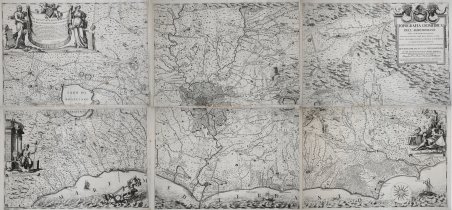 Topografia geometrica dell' Agro romano, ouero, La misura, pianta, e quantita di tutte le tenute e casali della campagna di Roma : con le citta, terre e castelli confinanti ad esse tenute : le strade, fiumi, fossi, aquedotti et altre cose principali e memorabili, si antiche come moderne / misurate e delineate con tutta esattezza da Gio. Battista Cingolani dalla Pergola Romano ; intagliata da Pietro Paolo Girelli Romano, l'anno MDCLXXXXII Grande carta catastale composta da 6 fogli - ognuno di circa 650x560 mm - dei dintorni di Roma, disegnata dall'agrimensore Cingolani. Pubblicata per la prima volta nel 1692 da Matteo Gregorio de Rossi, con dedica del Cingolani a Papa Innocenzo XII. Ripubblicata nel 1704 da Domenico de Rossi, con dedica del figlio di Domenico, Lorenzo Filippo, al marchese Francesco Maria Ruspoli. Dopo aver accuratamente seguito il progetto per l’ampliamento e la sistemazione di Roma, papa Alessandro VII (Fabio Chigi) dava l’incarico a diversi topografi ed agronomi di formare il catasto dell’Agro Romano, conferendo al gesuita Francesco Eschinardi il compito di dirigere la parte cartografica. L’Eschinardi affidò l’incarico al perito agrario di Urbino Giovanni Battista Cingolani, il quale realizzò un pregevole rilievo, che venne alle stampe per la prima volta nel 1692, edito da Matteo Gregorio de Rossi ed incisa da Pietro Paolo Girelli. Una seconda, identica, edizione della carta, edita questa volta da Domenico De Rossi, viene stampata nel 1704. Successivamente Padre Ridolfino Venuti pubblica la carta con una addenda che contiene il catalogo alfabetico delle tenute col nome dei possessori e l’area di ciascuna. La carta viene ristampata nel 1770 dalla Calcografia Camerale; il direttore Giovanni Domenico Campiglia firma il “libretto” accompagnatorio alla carta che contiene l’Indice dei Nomi. Nell’ultima pagina dell’indice troviamo l’imprint: Nella Calcografia Pontificia l’anno MDCCLXX Alle Calende di Settembre, del Pontificato di N. S. Clemente XIV Anno Secondo. Magnifico esemplare del secondo stato – con imprint di Domenico de Rossi e data 1704 - di questo importantissimo rilievo sulla regione. Bibliografia Almagià, Documenti Cartografici dello Stato Pontificio p. 40/41, tav. LXX/LXXII. Istituto di Studi Romani, a cura di A. Frutaz, Le Carte del Lazio, XXXII.1, tavv. 160-166. Topografia geometrica dell' Agro romano, ouero, La misura, pianta, e quantita di tutte le tenute e casali della campagna di Roma : con le citta, terre e castelli confinanti ad esse tenute : le strade, fiumi, fossi, aquedotti et altre cose principali e memorabili, si antiche come moderne / misurate e delineate con tutta esattezza da Gio. Battista Cingolani dalla Pergola Romano ; intagliata da Pietro Paolo Girelli Romano, l'anno MDCLXXXXII. Cadastral map of the area around Rome, drawn by the surveyor Cingolani. First published 1692 by Matteo Gregorio de Rossi, with Cingolani's dedication to Pope Innocent XII. Reissued 1704 by Domenico de Rossi, with dedication by Domenico's son Lorenzo Filippo to Marchese Francesco Maria Ruspoli. After carefully following the project for the enlargement and arrangement of Rome, Pope Alexander VII (Fabio Chigi) commissioned several topographers and agronomists to form the cadastre of the Agro Romano, giving the Jesuit Francesco Eschinardi the task of directing the cartographic part. Eschinardi entrusted the task to the Urbino agrarian surveyor Giovanni Battista Cingolani, who produced a valuable survey, which came to press for the first time in 1692, edited by Matteo Gregorio de Rossi and engraved by Pietro Paolo Girelli. A second, identical edition of the map, this time edited by Domenico De Rossi, was printed in 1704. Later Father Ridolfino Venuti publishes the map with an addenda containing the alphabetical catalog of the estates with the names of the owners and the area of each. The map is reprinted in 1770 by the Calcografia Camerale; director Giovanni Domenico Campiglia signs the "booklet" accompanying the map that contains the Index of Names. On the last page of the index we find the imprint: Nella Calcografia Pontificia l'anno MDCCLXX Alle Calende di Settembre, del Pontificato di N. S. Clemente XIV Anno Secondo. Example of the second state of the map, with the date 1704 and the imprint of Domenico De Rossi. In the cartouche at upper left the dedication of Lorenzo Filippo to Marchese Francesco Maria Ruspoli. Magnificent example of this very important relief on the region. Bibliografia Almagià, Documenti Cartografici dello Stato Pontificio p. 40/41, tav. LXX/LXXII. Istituto di Studi Romani, a cura di A. Frutaz, Le Carte del Lazio, XXXII.1, tavv. 160-166. Cfr.