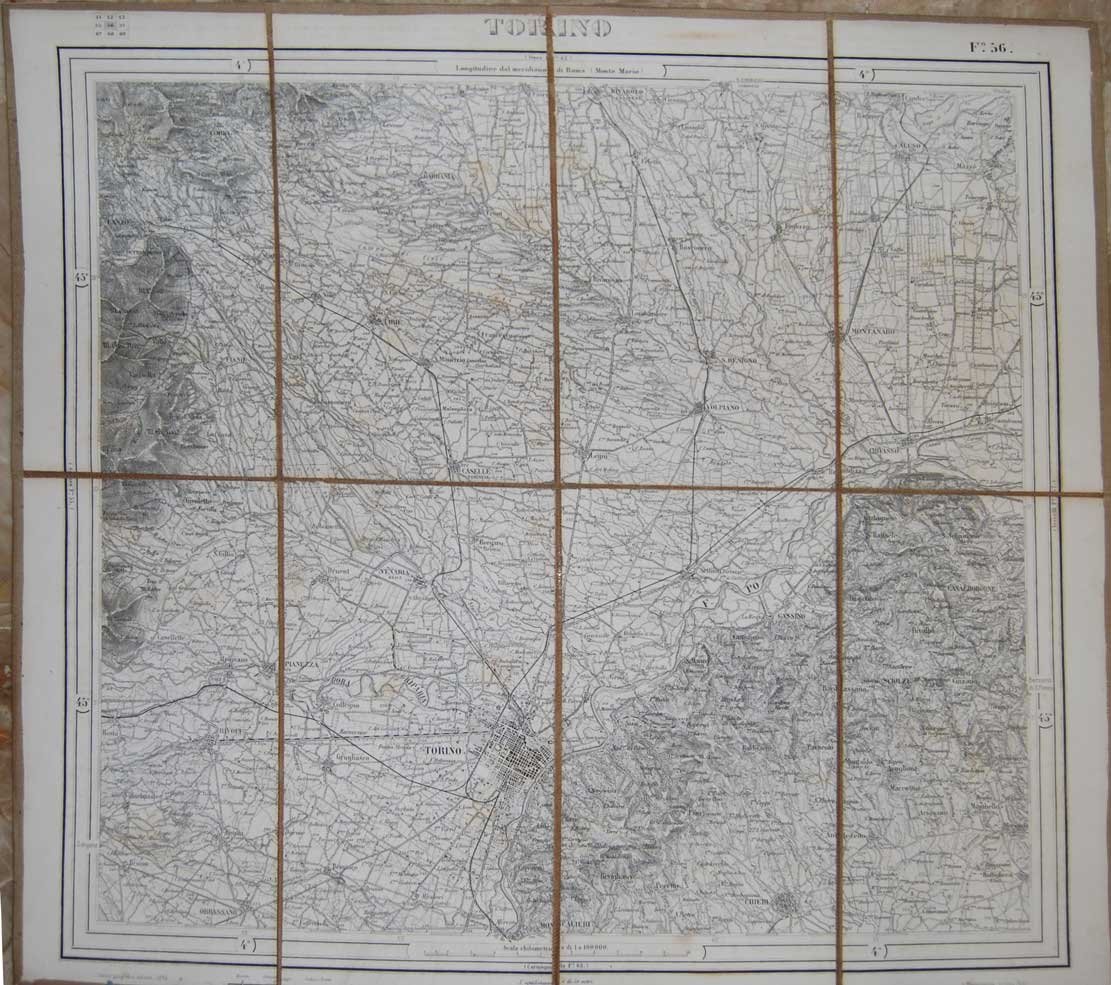 Cm. 47x44, carta geografica di parte della Provincia di Torino, telata, divisa in 8 riquadri. Scala 1:100.000. In buono stato (good copy).