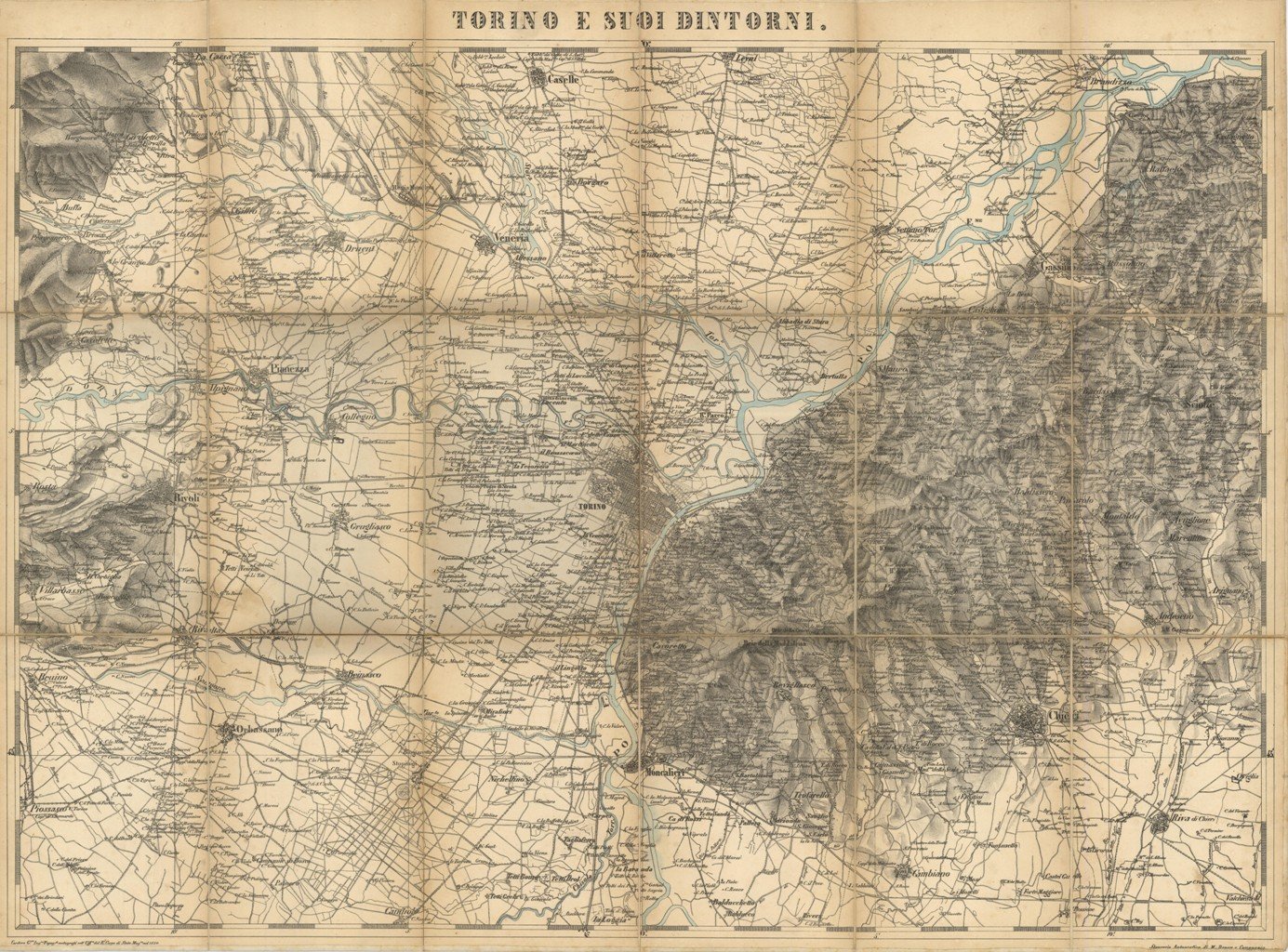 Carta geografica, antica ed originale, della provincia di Torino, molto particolareggiata, in cui si evidenziano oltre alla città di Torino le seguenti cittadine: Caselle, Leyni, Brandizzo, Druent,Venaria, Settimo Torinese, Gassino, Pianezza, Rivoli, Grugliasco, Andeseno, Rivalta, Revigliasco, Chieri, Beinasco, Orbassano, Moncalieri, Cambiano. Pubblicata su tela in 18 stacchi dalla Stamperia Autografica di M Doyen