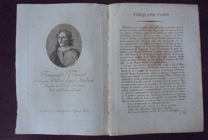 Tratta dalla Biografia degli Uomini Illustri del Regno di Napoli, di Domenico Martuscelli. Stampata a Napoli 1814/1824 da Nicola Gervasi. Ritratto in ovale di mm. 70 x 80 (=lxh) più margini. Firmata in basso a destra: Morghen. Corredata da quattro pagine di biografia. Bruniture.