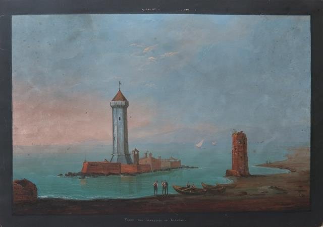 Gouache su carta, 1820 circa, cm 20,2 x 30,2 (la parte figurata) e cm 23,2 x 33,2 (il foglio), sottile margine di filetto nero appena percettibile e ben integrato a una più alta filettatura sempre in nero, titolo scritto in bianco, in minuto stampatello al margine inferiore. Scena raffigurante la Torre del Marzocco, con alcune piccole figure di pescatori intente al lavoro intorno ad alcune barche sulla riva, altre miniaturali figure accennate in lontanananza sempre sulla riva, piccole imbarcazioni a vela nel mare; il tutto avvolto in un'atmofera velata e mattutina. Minimi punti di caduta di colore al filetto nero superiore, bella la coloritura che spazia tra il marrone della costa e il turchese del mare, per attenuarsi nelle tonalità più lievi del celeste e del rosato del cielo. Fisiologici difetti della carta, buono stato di conservazione.