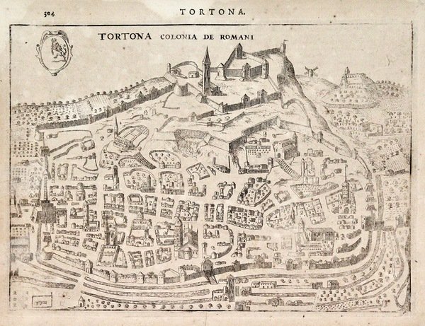 Incisione in rame, 180x250. Tratta da "Nova et accurata Italiae hodiernae descriptio". Bella pianta prospettica della città piemontese. Jodocus Hondius, latinizzazione dall'olandese di Joost de Hondt (1563-1612) fu pittore, incisore e cartografo fiammingo. La sua attività, continuata dall' omonimo figlio, contribuì a fare di Amsterdam il centro della cartografia europea del XVII secolo. Buon esemplare, lievemente brunito con due strappetti marginali restaurati a sin.
