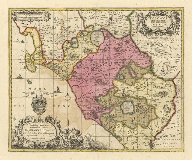 Affascinante carta geografica della Toscana. Nell'angolo in alto a destra decorativo cartiglio affiancato da figure allegoriche in cui è iscritto il titolo. Nell'angolo opposto, sempre in cartiglio a volute, sono riportate le scale grafiche: Milliaria Italica communia e Milliaria Germania communia. Nell'angolo in basso a sinistra in sontuso cartiglio arricchito da numerose figure allegoriche, viene riportata la dedica D. Johanni Honigh. La carta è caratterizzata da una vivace coloritura coeva all'acquerello. Ottima conservazione