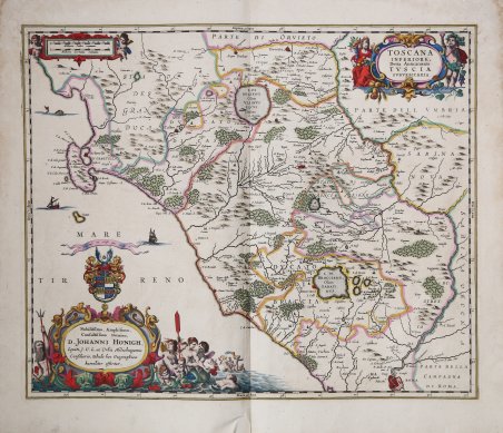 Bella e decorativa mappa che copre l'area territoriale della Tuscia suburbicaria, ovvero la parte dell'antica Etruria che si estendeva a sud del fiume Arno e comprendeva anche parte del Lazio. Nell'angolo in alto a destra decorativo cartiglio affiancato da figure allegoriche in cui è iscritto il titolo. Nell'angolo opposto, sempre in cartiglio a volute, sono riportate le scale grafiche: Milliaria Italica communia e Milliaria Germania communia. Nell'angolo in basso a sinistra in sontuoso cartiglio arricchito da numerose figure allegoriche, è presente una dedica particolarmente elaborata al giurista Johan Honigh di Middleburg, in Zelanda. Sembra che la carta non sia mai stata una componente regolare dell'atlante Jansson, il che spiegherebbe la sua scarsità. Van der Krogt descrive la carta come un'aggiunta a pochi atlanti di Jansson, senza una chiara data di inizio; la prima data che fornisce è il 1675. La lastra del Janssonius verrà da pubblicata solo nell'edizione del 1675 dell'Atlas Major sive Cosmographia Universalis. La mappa fu ristampata da Pieter Schenk e Gerard Valk dalla lastra di Jansson verso il 1700, con il proprio indirizzo, posto sotto il cartiglio con il titolo. Joannes Janssonius, figlio dell'editore di Arnhem Jan Janssen, sposò Elisabeth Hondius, figlia di Jodocus Hondius, ad Amsterdam nel 1612. Dopo il suo matrimonio, si stabilì in questa città come libraio ed editore di materiale cartografico. Nel 1618 si stabilì ad Amsterdam accanto alla libreria di Willem Jansz. Blaeu, entrando in una seria competizione. Le sue attività non riguardavano solo la pubblicazione di atlanti e libri, ma anche di mappe singole e un vasto commercio di libri con filiali a Francoforte, Danzica, Stoccolma, Copenaghen, Berlino, Koningsbergen, Ginevra e Lione. Nel 1631 iniziò a pubblicare atlanti insieme a Henricus Hondius. Nei primi anni 1640 Henricus Hondius lasciò l'attività di pubblicazione di atlanti completamente a Janssonius. La concorrenza con Joan Blaeu, figlio e successore di Willem, nella produzione di atlanti spinse Janssonius ad ampliare il suo ' Atlas Novus ' finalmente in un'opera di sei volumi, in cui furono inseriti un atlante marino e un atlante del Vecchio Mondo. Dopo la morte di Joannes Janssonius, il negozio e la casa editrice furono continuati dagli eredi sotto la direzione di Johannes van Waesbergen (c. 1616-1681), genero di Joannes Janssonius. Le matrici degli atlanti di Janssonius furono in seguito vendute a Schenk e Valck. Incisione su rame, bella coloritura d'epoca, verso bianco, senza testo. Leggere macchie di umidità ai margini laterali, per il resto ottimo stato di conservazione. Bibliografia Van der Krogt 1, Atlantes Neerlandici, n. 406. Map of the area north of Rome, reaching to Orvieto and Orbetello, here called Lower Tuscany. Two decorative cartouches with cherubs, scale of miles and coat of arms. A richly decorative map, in a superb example, of the northern Latium region of Italy, depicting the area from Rome in the south to Orvieto in the north, and delimited by the Tiber River in the east. It appears that the map was never a regular component of the Jansson atlas, which would explain its scarcity. Van der Krogt describes the map as an addition to just a few of Jansson’s atlases with no clear beginning date; the earliest date he gives is 1675. There is an especially elaborate dedication to the jurist, Johan Honigh of Middleburg, Zeeland. ' This beautiful map appears only in Janssonius's Atlas Major Sive Cosmographia Universalis, ' published in 1675. The map was, later, ' re-printed by Pieter Schenk and Gerard Valk from Jansson's plate ca. 1700. Joannes Janssonius (Arnhem, 1588-1664), son of the Arnhem publisher Jan Janssen, married Elisabeth Hondius, daughter of Jodocus Hondius, in Amsterdam in 1612. After his marriage, he settled down in this town as a bookseller and publisher of cartographic material. In 1618 he established himself in Amsterdam next door to Blaeu’s book shop. He entered into serious competition with Willem Jansz. Blaeu. His activities not only concerned the publication of atlases and books, but also of single maps and an extensive book trade with branches in Frankfurt, Danzig, Stockholm, Copenhagen, Berlin, Koningsbergen, Geneva, and Lyon. In 1631 he began publishing atlases together with Henricus Hondius. In the early 1640s Henricus Hondius left the atlas publishing business completely to Janssonius. Competition with Joan Blaeu, Willem’s son and successor, in atlas production prompted Janssonius to enlarge his ' Atlas Novus ' finally into a work of six volumes, into which a sea atlas and an atlas of the Old World were inserted. After the death of Joannes Janssonius, the shop and publishing firm were continued by the heirs under the direction of Johannes van Waesbergen (c. 1616-1681), son-in-law of Joannes Janssonius. The copperplates from Janssonius’s atlases were afterwards sold to Schenk and Valck. Copper engraving, old colored, verso blank, in very good condition. Bibliografia Van der Krogt 1, Atlantes Neerlandici, n. 406. Cfr.