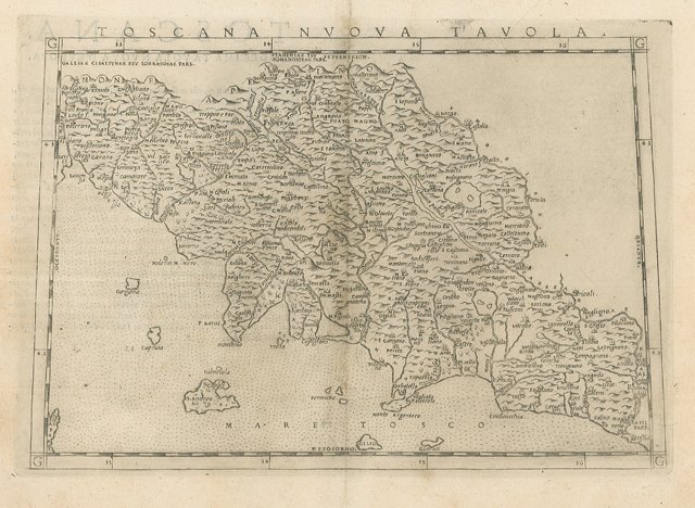 Carta della regione Toscana. Inserita nell'opera "La Geografia di Claudio Tolomeo alessandrino, già tradotta di greco in italiano da M. Giero. Ruscelli: & hora in questa nuoua editione da M. Gio. Malombra ricorretta, & purgata d'infiniti errori: . Con l'Espositioni del Ruscelli, . Con una copiosa tauola de' nomi antichi, dichiarati co' nomi moderni: dal Malombra riueduta, & ampliata. Et con un Discorso di M. Gioseppe Moleto, . "