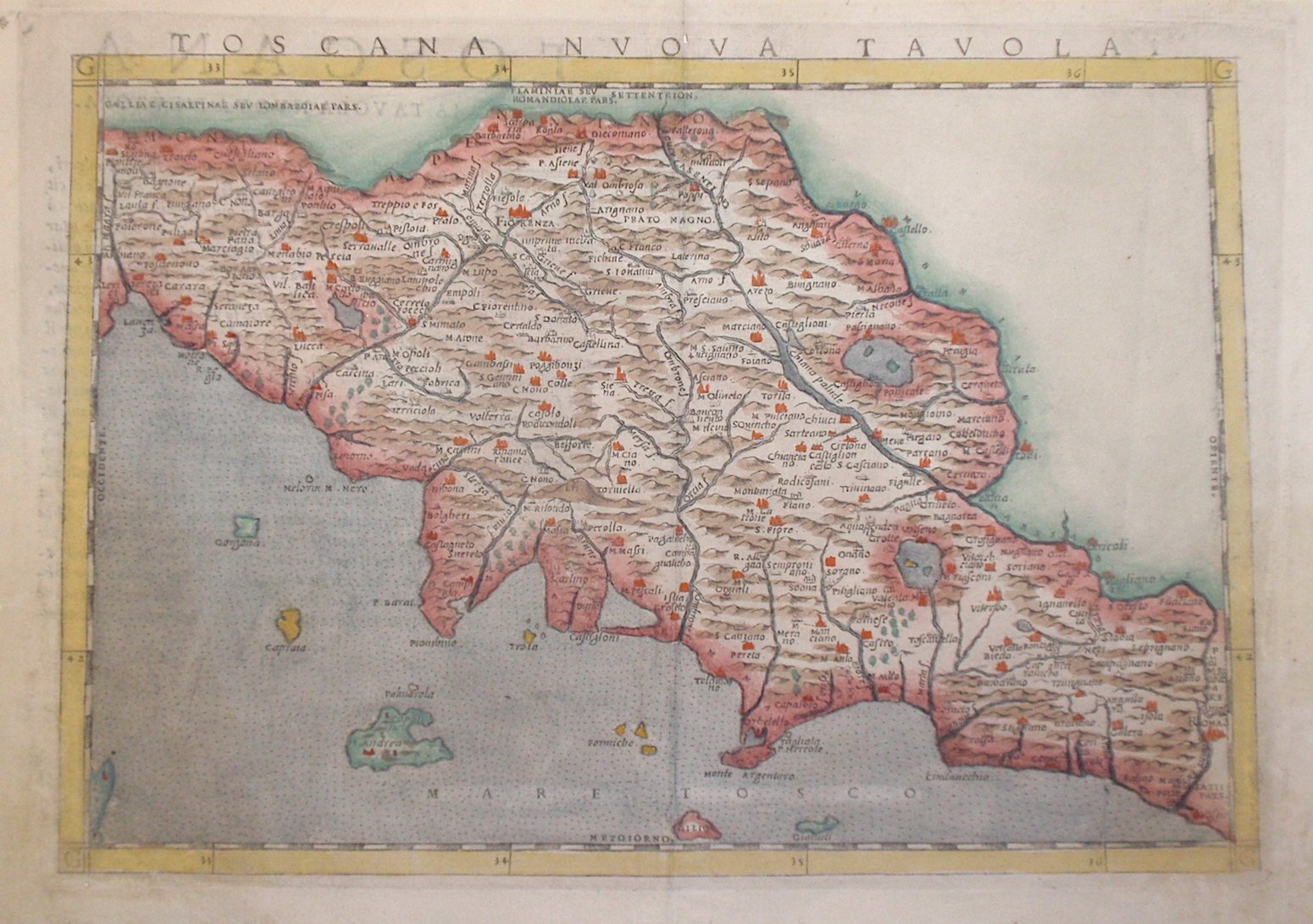 Incisione in rame, dipinta a mano, mm 190x263. Affascinante carta geografica raffigurante la toscana con le isole tirreniche secondo il modello Gastaldino.<BR>Tratta dall'edizione veneziana della "Geographia" di Tolomeo curata da Ruscelli. La carta è basata su quella di Gastaldi del 1548 pubblicata nella sua edizione della "Geografia" di qualche anno prima. <BR>Girolamo Ruscelli (1500-1566) nasce a Viterbo ed è un importante scrittore ed editore, che dopo aver studiato a Padova trascorse la propria carriera fra Roma e Napoli, dove morì.Tolomeo, il più grande cartografo dell'antichità, pubblicò La Geografia nel 150 d.C.; nel medioevo sopravvisse, grazie alla mediazione araba, manoscritta in greco e fu poi tradotta in latino da Jacopo D'Angelo; da inizio Quattrocento acquisì sempre più notorietà e nel 1477 fu pubblicata a Bologna la prima edizione illustrata a stampa comprendente solo carte del mondo antico, immediatamente seguita da altre edizioni nel 1478, -80, -82 che già presentavano alcune carte del mondo moderno. Con il susseguirsi delle edizioni, si incrementò il numero delle carte moderne consci che il mondo fosse ben diverso da quello di Tolomeo, fino a giungere alla celebre edizione del 1513 di Waldseemueller, il primo atlante moderno, composto da 20 carte nuove oltre alle antiche. Nel corso del XVI secolo ed oltre vennero poi editate numerose edizioni fra cui quelle curate da Ruscelli, le cui carte moderne sono quelle di Gastaldi del 1548 in versione ingrandita. <BR>Buon esemplare, con due piccoli fori marginali. <BR>