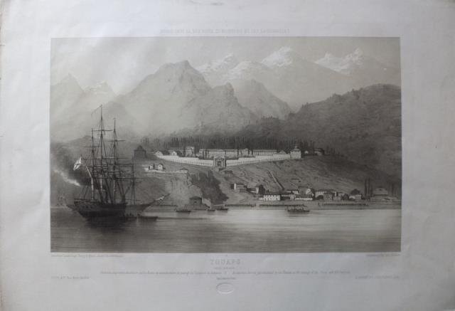 Imp. Lemercier, Goupil & C. Editeurs, Parigi, 1850 circa. Dal “Voyage dans la Mer Noire, le Bosphore et les Dardanelles” e da un disegno del Durand – Brager, “Pittore di Marina”, tonolitografia, cm 25,5 x 41,5 (la parte figurata) più margini. Bella veduta dell’attacco alla squadra francese. Buono stato.