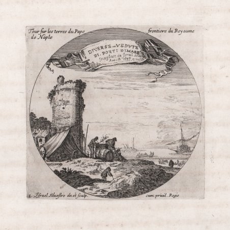 Veduta tratta dalla serie ' Diverse Vedute Di Porti Di Mare intagliate da Israël Silvestre. Anno D 1647. “Suite de 6 pièces sans numéros”. (cfr. Faucheux, Catalogue raisonné de toutes les estampes qui forment l'oeuvre d'Israel Silvestre). Il Silvestre, incisore e disegnatore, nasce a Nancy nel 1621. Come era consuetudine all'epoca, fece diversi viaggi in Italia per copiare i vecchi maestri e per migliorare le sue abilità con i più grandi maestri. Faucheux fissa le date di questi viaggi, il primo prima del 1640 (Israel non aveva ancora 20 anni), il secondo dal 1643 al 1644 e l'ultimo intorno al 1653. Israel portò con sé molte vedute dell'Italia, quasi tutte incise. Fino al 1659, fece altri viaggi in Francia e in Lorena, da cui trasse molti disegni e incisioni. Il suo stile fu, all'inizio, piuttosto sciolto, ma dal 1643 in poi divenne più raffinato e delicato, acquisendo accuratezza e precisione senza essere asciutto, risultando a volte simile a quello di Jacques Callot o di Stefano della Bella, con i quali ebbe rapporti di amicizia attraverso il suo zio materno e mentore, l’editore Israël Henriet. Accanto alle testimonianze per la Roma antica mostrò ben presto un grandissimo interesse per la città "moderna", divenendo uno dei precursori del vedutismo - non solo nel campo incisorio - anticipando artisti come Lievin Cruyl e Gaspar van Wittel. È praticamente impossibile fare un inventario completo delle opere di Israël Silvestre, tanto era prolifico l'artista. Ha lasciato numerosi disegni e più di mille incisioni. Tra le sue opere più belle, possiamo tuttavia menzionare le numerose e complesse “piccole” suite (composte da poche tavole) sulle piazze, le chiese e le antichità di Roma. Acquaforte, in ottimo stato di conservazione. Bibliografia L. E. Faucheux, Catalogue raisonné de toutes les estampes qui forment l'oeuvre d'Israel Silvestre: précédé d'une notice sur sa vie (1857), n. 14.1; F. Baré, Israël Silvestre et sa famille, suivi du catalogue de son oeuvre (1885), n. 574. View taken from the series ' Diverse Vedute Di Porti Di Mare intagliate da Israël Silvestre. Anno D 1647. “Suite de 6 pièces sans numéros”. (cfr. Faucheux, Catalogue raisonné de toutes les estampes qui forment l'oeuvre d'Israel Silvestre). Silvestre, engraver and draftsman, was born in Nancy in 1621. As was customary at the time, he made several trips to Italy to copy the old masters and to improve his skills with the greatest masters. Faucheux fixes the dates of these trips, the first before 1640 (Israel was not yet 20 years old), the second from 1643 to 1644 and the last around 1653. Israel brought with him many views of Italy, almost all of them engraved. Until 1659, he made other trips to France and Lorraine, from which he took many drawings and engravings. His style was, at the beginning, rather loose, but from 1643 onwards became more refined and delicate, acquiring accuracy and precision without being dry, resulting sometimes similar to that of Jacques Callot or Stefano della Bella, with whom he had friendly relations through his maternal uncle and mentor, the publisher Israël Henriet. Alongside the testimonies to ancient Rome, he soon showed great interest in the "modern" city, becoming one of the precursors of vedutism - not only in the field of engraving - anticipating artists such as Lievin Cruyl and Gaspar van Wittel. It is quite impossible here to make a complete inventory of Israël Silvestre's works, so prolific was the artist. He left numerous drawings and more than a thousand engravings. However, among his most beautiful works, we can mention the many complex "small" suites (composed of a few plates) on the squares, churches and antiquities of Rome. Etching, in excellent condition. Bibliografia L. E. Faucheux, Catalogue raisonné de toutes les estampes qui forment l'oeuvre d'Israel Silvestre: précédé d'une notice sur sa vie (1857), n. 14.1; F. Baré, Israël Silvestre et sa famille, suivi du catalogue de son oeuvre (1885), n. 574. Cfr.