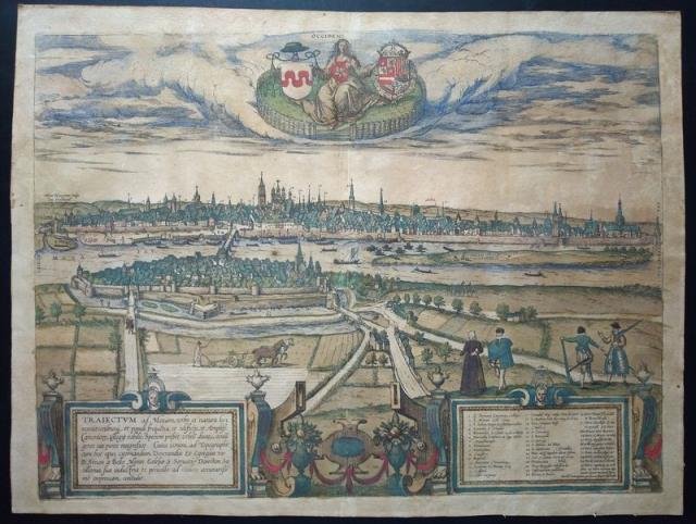Amsterdam, 1657 circa. Dal “Theatrum Praecipuarum Urbium” del Janssonius, pubblicata tra il 1652 ed il 1657, composta da circa 500 tavole raccolte in 8 volumi aventi tutti un titolo diverso. L’opera si rifà al “Civitates Orbis Terrarum” di Braun & Hogenberg, uno dei libri più importanti sui piani urbanistici divulgati nel corso del XVII secolo, le cui lastre furono acquistate dopo la morte di Abraham Hogenberg. Incisione in rame all'acquaforte, colore d'epoca, cm 37,2 x 49,8 circa (alla lastra), più margini. Cartiglio in basso, sulla sinistra, legenda in basso, sulla destra, entro riquadri, figure e animali, testo latino al verso con grande capolettera che inizia la descrizione delle città di Traiectum ad Mosam. Mosa Traiectum, nota anche con la variante Trajectum, è il nome latino della città olandese di Maastricht e significa letteralmente "per attraversare la Mosa". A volte veniva indicata come Traiectum Superior, per distinguerla da Trajectum Inferior, l'attuale Utrecht, chiamata anche Traiectum ad Rhenum. Non è chiaro se il nome sia di origine romana. Sebbene probabilmente Maastricht non sia mai stata una città romana, molti scavi archeologici mostrano che la città è stata un insediamento significativo durante tutto il periodo della presenza romana nei paesi Bassi, e la città è infatti sede di punti di interesse storici, come ci si può aspettare da un luogo risalente al periodo romano. Traiectum ad Mosam era un villaggio di medie dimensioni vicino al luogo in cui la strada principale era Tongeren (la capitale dei Tungri), e Colonia (la capitale degli Ubiani e della Germania Inferiore) e attraversava la Mosa. Nel IV secolo, la città, che fungeva da porto di Tongeren, fu pesantemente fortificata e questo castello divenne il nucleo della città medievale e moderna. Il municipium romano "traiectum ad Mosam" che risale al 50 a. C. si sviluppò con il cristianesimo sin dall'epoca tardo imperiale, fu sede vescovile dal 380 al 722 e il suo primo pastore fu San Servazio. Foglio uniformemente brunito, una rottura rimarginata nella parte destra (circa 10 cm) in vivace e bella coloritura, sano l'inciso.