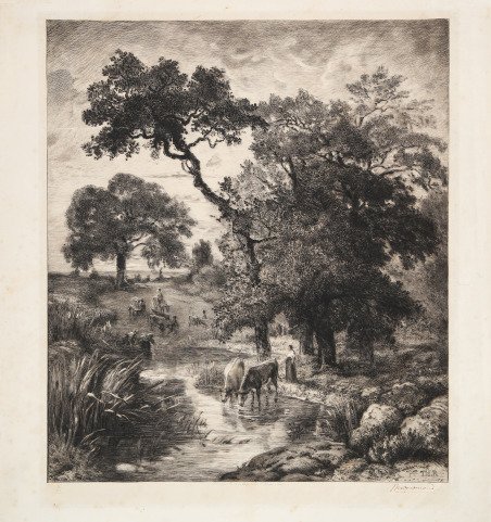 Acquaforte e puntasecca, 1882, da un soggetto di Théodore Rousseau. Impressione con firma autografa di Bracquemond; in basso a destra, timbro a secco della Printseller Association. Magnifica prova, del sesto stato su sei descritto da Beraldi, impressa su carta Cina, in eccellente stato di conservazione. Il dipinto di Rousseau da cui proviene l'acquaforte è Coucher de soleil : ou, Un abreuvoir ( ca. 1850-55 ), che è apparso all'asta da Sotheby's . New York, 17 febbraio 1993, lotto n. 12, intitolato Coucher de soleil dans les landes prés de Begaar e che oggi si trova in una collezione privata. Il quadro di Rousseau fu il primo dipinto dell'importante maestro acquistato dalla neonata galleria Arnold & Tripp, che aveva aperto nel gennaio 1881: fu acquistato da Georges Petit, esperto di Vente Hartmanna, per 20.000 franchi il 16 maggio 1881, e venduto il giorno seguente per 26.000 franchi al collezionista portoghese Pedro Eugenio Daupias. Arnold & Tripp, dopo aver acquistato e subito venduto il quadro Coucher de soleil, decisero di chiedere a Bracquemond di realizzare una lastra da cui ricavare delle copie da vendere. Questo indica che la galleria aveva mantenuto i diritti di riproduzione del dipinto, o almeno aveva un accordo con il proprietario in tal senso. L'identificazione del quadro da cui proviene l'acquaforte è quindi particolarmente interessante perché Bracquemond non fu incaricato di produrre un'incisione per promuovere la vendita del quadro, che la galleria aveva già venduto a Daupias nel maggio 1881. Piuttosto, come era comune con le incisioni, si rivolgeva al suo particolare mercato di collezionisti, sicuramente interessati ad avere un'incisione da un dipinto che era diventato parte di una famosa collezione di Lisbona, e che non avrebbero più potuto ammirare a Parigi. La scoperta del contratto stipulato tra la galleria parigina Arnold & Tripp e il pittore e incisore Felix Bracquemond è un fatto recente. Il contratto fa parte di un gruppo di sette lettere, contenute nel carteggio Arnold & Tripp, che illustrano tutti gli aspetti dell'affare, dal contratto formale del luglio 1881, alle varie fasi delle prove, fino alla lastra finale da presentare al Salone parigino del 1882. Per un’approfondimento sul tema, si rimanda al saggio di Paolo Serafini, An Inside View of the Print Market in Paris (1881) A Contract between Félix Bracquemond and the Arnold & Tripp Gallery to Realize a Plate after Théodore Rousseau, in “Getty Research Journal”, n. 10 (2018), pp. 207-224). Già nel contratto Bracquemond fa riferimento a sei stati della lastra, poi descritti da Henri Beraldi (cfr. Les Graveurs du XIXe siècle s…, t. 3, pp. 109-110). Etching and drypoint, 1882, inscribed beneath the image lower left B lower Publie par Arnold et Tripp. & Rue St Georges a Paris. In the image, lower right TH. R After a painting by Théodore Rousseau. Example in the sixth finale state, with the signature and the publisher’s address lower centre. Etched by Félix Bracquemond (1833–1914). Impression signed by Bracquemond, in pencil. Printsellers' Association's blind stamp at lower left. The painting from which the etching comes is Coucher de soleil : ou, Un abreuvoir ( ca. 1850-55 ), which appeared at auction at Sotheby's . New York , 17 February 1993 , lot no . 12 , titled Coucher de soleil dans les landes prés de Begaar and which today is held in a private collection. ' The Rousseau painting was the first painting by the important master purchased by the newborn gallery Arnold & Tripp gallery, which had opened in January 1881. The painting was bought from Georges Petit for 20,000 francs od 16 May 1881, and sold the following day for 26,000 francs to the Portuguese collector Pedro Eugenio Daupias. Arnold & Tripp, after having purchased and ' immediately sold the painting Coucher de soleil , decided to ask Bracquemond to produce a plate from which to derive copies to sell . This indicates that Arnold & Tripp had retained the reproduction rights for the painting , or at least had an agreement with the owner to that effect. The identification of the painting from which the etching comes is therefore particularly interesting because Bracquemond was not contracted to produce an engraving in order to promote the sale of the painting, which the gallery had already sold to Daupias in May 1881. Rather, as was common with artists' etchings, it was aimed at its own particular market of collector, surely interesting in having an engraving of a painting that had become part of a famous collection in Lisbon, and which they would no longer be able to admire in Paris. Recently, in the archives of the Getty Research Institute was discovered a contract between the Parisian gallery Arnold & Tripp and the painter and etcher Felix Bracquemond (1833-1914) in order to realize a plate after a painting by Théodore Rousseau. The contract is part of a group of seven letters, contained in the Arnold & Tripp correspondance, that illustrate all the aspects of the deal, from the formal contract in July 1881 , to the various phases of the proofs, toward the final plate to be presented at the Parisian Salon of 1882. (cfr. Paolo Serafini, An Inside View of the Print Market in Paris (1881) A Contract between Félix Bracquemond and the Arnold & Tripp Gallery to Realize a Plate after Théodore Rousseau, in Getty Research Journal, n. 10 (2018), pp. 207-224). Cfr. H. Beraldi, tome 3, pp. 109 - 110; Paolo Serafini, An Inside View of the Print Market in Paris (1881) A Contract between Félix Bracquemond and the Arnold & Tripp Gallery to Realize a Plate after Théodore Rousseau, in “Getty Research Journal”, n. 10 (2018)