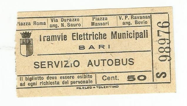 TRAMVIE ELETTRICHE MUNICIPALI BARI BIGLIETTO AUTOBUS servizio urbano cent. 50