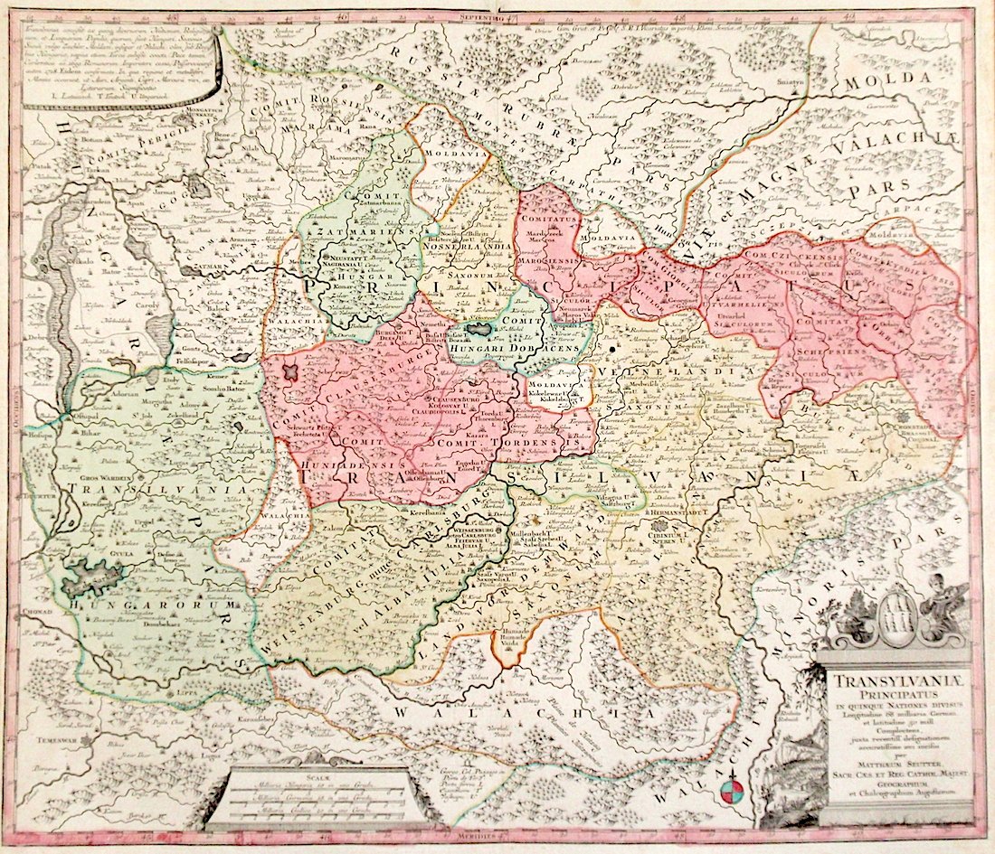 Incisione in rame, mm 495x580, coloritura originale d'epoca, tratta da Atlas Maior. Seutter, dopo un apprendistato presso Homann a Norimberga, trasferitosi ad Augsburg verso il 1720, aprì la propria attività superando il maestro sotto il profilo della bellezza: le sue carte hanno sempre colori brillanti e cartigli elaborati. Infatti sono presenti due bellissimi cartigli decorati con varie raffigurazioni allegoriche. Esemplare in ottimo stato di conservazione.