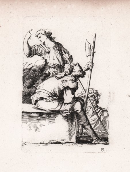 Acquaforte, circa 1675/80, priva di firma. Copia in controparte della stampa di Salvator Rosa, della serie dei capricci con soldati, detta le ' Figurine. ' La serie delle cosiddette ' Figurine ' di Salvator Rosa ebbe un grande successo, documentato dal gran numero di imitazioni che ebbe in tutta Europa. La prima edizione di questa raccolta fu realizzata dal Rosa in 62 tavole all’acquaforte incise tra il 1656 e il 1657. Almeno otto diverse copie della stessa edizione furono eseguite tra la fine del XVII e la prima metà del XVIII secolo. ' ' La serie venne inserita nella celebre ' Academia Todesca della Architectura, Scultura & Pittura: oder Teutsche Academie der Edlen Bau, Bild-und Mahlerey-Künste, raccolta monumentale, riccamente illustrata da centinaia di incisioni raffiguranti antichità, architettura e mitologia classica, edita a Norimberga e Francoforte tra il 1675 ed il 1680. ' Per le incisioni, il Sandrart si avvalse dei suoi collaboratori Karl Gustav von Amling (1650-1703); Philip Kilian (1628-1693); Richard Collin (1627-97); Georg Andreas Wolfgang (1631-1716); Johann Georg Waldreich (d.1680); Melchior Küsel (1626-1683); Franck, Johann (fl.1659-1690); George Christoph Eimmart (1638-1705); Susanna Maria von Sandrart (1658-1716); Bartholomäus Kilian (1630-1696). Bellissima prova, impressa su carta vergata coeva, con margini, in perfetto stato di conservazione. ' Bibliografia Cfr. Bartsch, Le ' Peintre graveur ' (XX.283.51); Wallace p. 330, 133; National Gallery (Washington), ' Mark J. Millard, III (1998), no. 111; F.W. H. Hollstein, ' German engravings . ca. 1400-1700 ' (1954-), 38-41; Anna Schreurs, ' Unter Minerva schutz: bildung durch kunst in Joachim von Sandrarts 'Teutscher Academie' ' (2012). Etching, ca. 1675/80, unsigned. Copy of Salvator Rosa's print from the Capricci with soldiers series, called the ' Figurine. The series of the so-called ' Figurine ' of Salvator Rosa had a great success, documented by the large number of imitations that had throughout Europe. The first edition of this collection was made by Rosa in 62 etching plates engraved between 1656 and 1657. At least eight different copies of the same edition were made between the end of the 17th and the first half of the 18th century. This set is part of the monumental ' Academia Todesca della Architectura, Scultura & Pittura: oder Teutsche Academie der Edlen Bau, Bild-und Mahlerey-Künste ' (Deutsche Academy of Architecture - Sculpture – Painting). ' The first edition, in German, was published by Joachim von Sandrart in Nuremberg, in three volumes respectively in 1675, 1679 and 1680. For the plates Sandrart used his students as and many others artist as ' Karl Gustav von Amling (1650-1703); Philip Kilian (1628-1693); Richard Collin (1627-97); Georg Andreas Wolfgang (1631-1716); Johann Georg Waldreich (d.1680); Melchior Küsel (1626-1683); Franck, Johann (fl.1659-1690); George Christoph Eimmart (1638-1705); Susanna Maria von Sandrart (1658-1716); Bartholomäus Kilian (1630-1696). The work is full of illustrations of ancient and modern Roman buildings, sculpture, the theory of painting, biographies of artists, including German and contemporary (ie seventeenth-century) artists, and antiquities. Joachim von Sandrart was a painter of some note but it is for his ' Teutsche Academie ' that he is chiefly remembered. His compendious treatise includes sections on ancient sculpture and architecture, perspective, the theory of painting, artists’ biographies, a translation of Ovid’s Metamorphoses and so on. The second part of Book I purports to give a history of art from its earliest origins, and opens with an engraving of two scenes of legendary accounts of the discovery of drawing. ' The work is dedicated to the world-renowned German nation and to champions and lovers of art ('Der Welt-berühmten Teutschen Nation . Kunst-Helden und Kunstliebenden'). Beautiful proof, printed on contemporary laid paper, with margins, in perfect condition. Bibliografia Cfr. Bartsch, Le ' Peintre graveur ' (XX.283.51); Wallace p. 330, 133; National Gallery (Washington), ' Mark J. Millard, III (1998), no. 111; F.W. H. Hollstein, ' German engravings . ca. 1400-1700 ' (1954-), 38-41; Anna Schreurs, ' Unter Minerva schutz: bildung durch kunst in Joachim von Sandrarts 'Teutscher Academie' ' (2012). Cfr.