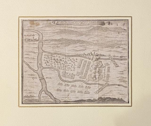 Germania, 1720 circa. Incisione in rame all'acquaforte, cm 16,5 x 21,5 (il foglio). Piccolo piano della battaglia di Chiari con titolo entro cartiglio a svolazzo in alto al centro. Da notare come normalmente questa piccola raffigurazione la si trovi con il titolo didascalico sotto l'immagine; questa nostra variante la rende perciò di incerta attribuzione, per quanto l'autore sia quasi certamente uno fra i due e la datazione grossomodo la medesima. In margini e in buono stato. .