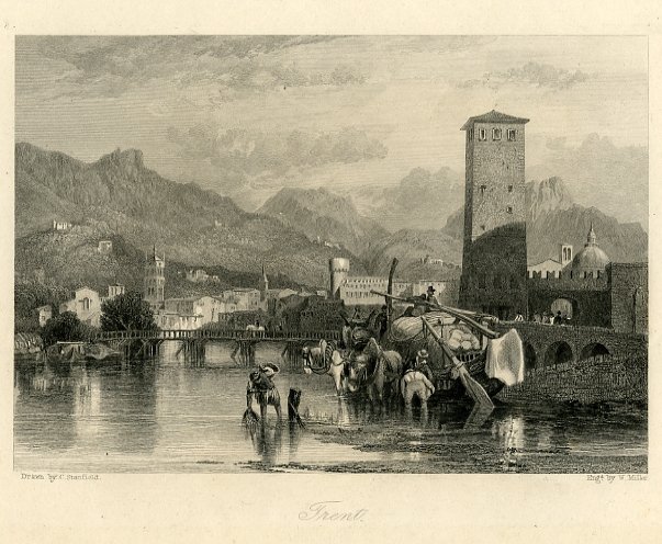 Calcografia di dimensioni 103x158 mm. Condizioni : USATO - Stato : Buono, ordinari segni d'uso e del tempo. Altre note : Veduta panoramica del ponte di S. Lorenzo sul fiume Adige, presso Trento, con il profilo dei monti sullo sfondo e una scena di vita quotidiana in primo piano. Titolo riproposto in diverse versioni. Scheda bibliografica tratta da "Trento nelle Stampe d'Arte" di Aldo Chemelli, schede n. 62 e 63 pagg. 224 e 225.