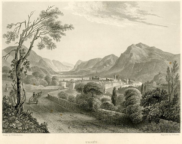Litografia di dimensioni 140x182 mm. Piccolo taglio di circa 1 cm sul bordo inferiore in uno dei due esemplari. Condizioni : USATO - Stato : Buono, ordinari segni d'uso e del tempo. Altre note : Veduta panoramica di ispirazione romantica raffigurante la città di Trento in lontananza immersa in una natura maestosa. Presenti in basso sopra il titolo informazioni sull'autore, sull'editore e sull'incisore E. Finden. Scheda bibliografica tratta da "Trento nelle Stampe d'Arte" di Aldo Chemelli, scheda n. 79 pagg. 252 e 253.