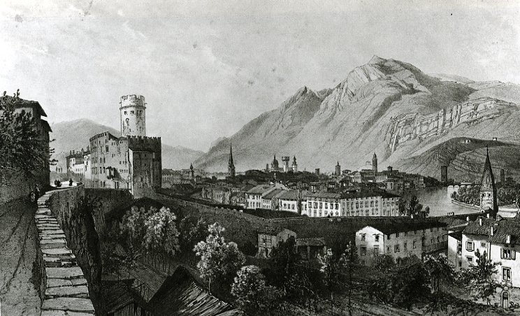 Litografia a due tinte di dimensioni 270x425 mm. Condizioni : USATO - Stato : Buono, ordinari segni d'uso e del tempo. Altre note : Veduta paesaggistica raffigurante la città di Trento e le montagne circostanti da via della Pontara. L'accuratezza nella resa del monte Bondone e di Sardagna fa pensare a una riproduzione dal vero. L'incisore è Eugène Cicéri. Scheda bibliografica tratta da "Trento nelle Stampe d'Arte" di Aldo Chemelli, scheda n. 54 pag. 210. Con cornice di noce di fattura non recente.