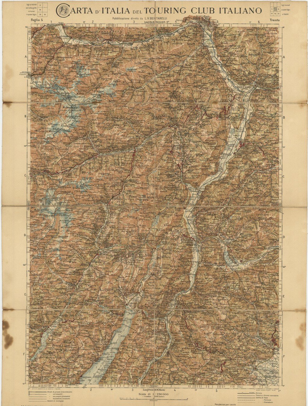 Carta geografica, antica ed originale, riguardante il territorio dal Lago di Garda a Merano. Autore: Istituto Geografico De Agostini. Luogo: Trentino Alto Adige. Anno: primo '900. Tecnica: litografia. Dimensioni: 510x380. La carta dieretta da L. V. Bertarelli, si presenta in scala 1:250.000 ed è editorialmente telata a stacchi. Autore: Istituto Geografico De Agostini. Luogo: Trentino Alto Adige. Anno: primo '900. Tecnica: litografia. Dimensioni: 510x380 mm