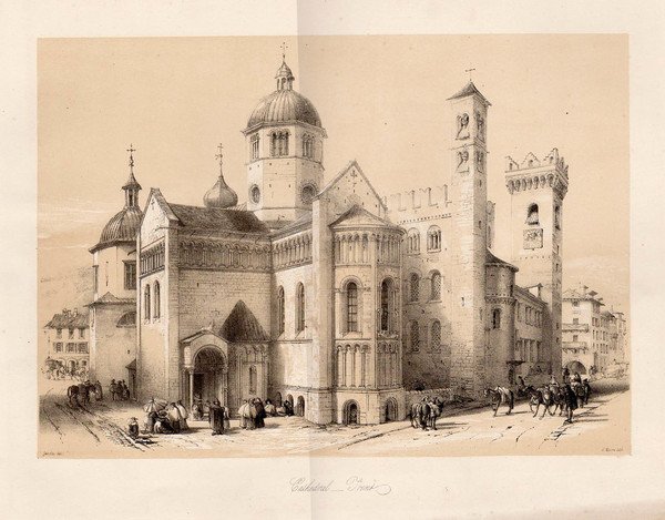 TRENTO - Cathedral-Trent. Suggestiva ed animata litografia molto particolareggiata raffigurante l'intera cattedrale e dintorni.