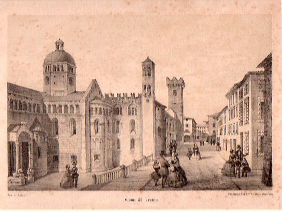 Litografia di dimensioni 155x195 mm. Condizioni : USATO - Stato : Buono, ordinari segni d'uso e del tempo. Altre note : Veduta tipica della città di Trento ad opera di Basilio Armani. Il foglio rappresenta il Duomo di Trento visto dal Castelletto. Presenti sul lato inferiore della singola stampa le iscrizioni "Gez. v. Armani - Gedruckt bei I.B. Kuhn in München". Scheda bibliografica tratta da "Basilio Armani: panorami del Garda e del Tirolo" a cura di Marina Botteri Ottaviani, schede n. 78 e 79.
