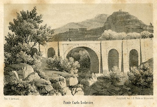 Litografia di dimensioni 85x135 mm. Presenti bruniture e foxing. Condizioni : USATO - Stato : Buono, ordinari segni d'uso e del tempo. Altre note : Veduta del Ponte Carlo Lodovico presso Trento. Presenti in basso le iscrizioni "Gez. v. Armani - Gedruckt bei I.B. Kuhn in München". Scheda bibliografica tratta da "Basilio Armani: panorami del Garda e del Tirolo" a cura di Marina Botteri Ottaviani, scheda n. 89.