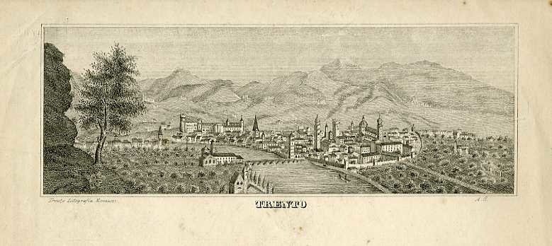 Litografia di dimensioni 6,5x18 cm. Condizioni : USATO - Stato : Buono, ordinari segni d'uso e del tempo. Altre note : La novità della veduta, colta e ritratta dalla balza di Sardagna o da San Nicolò, è data da un'insolita ampiezza e puntualità riservata al rilievo montuoso e al largo paesaggio del primo piano. L'opera è attribuibile al Godermayr. Scheda bibliografica tratta da "Trento nelle Stampe d'Arte" di Aldo Chemelli, scheda n. 61 pagg. 222.