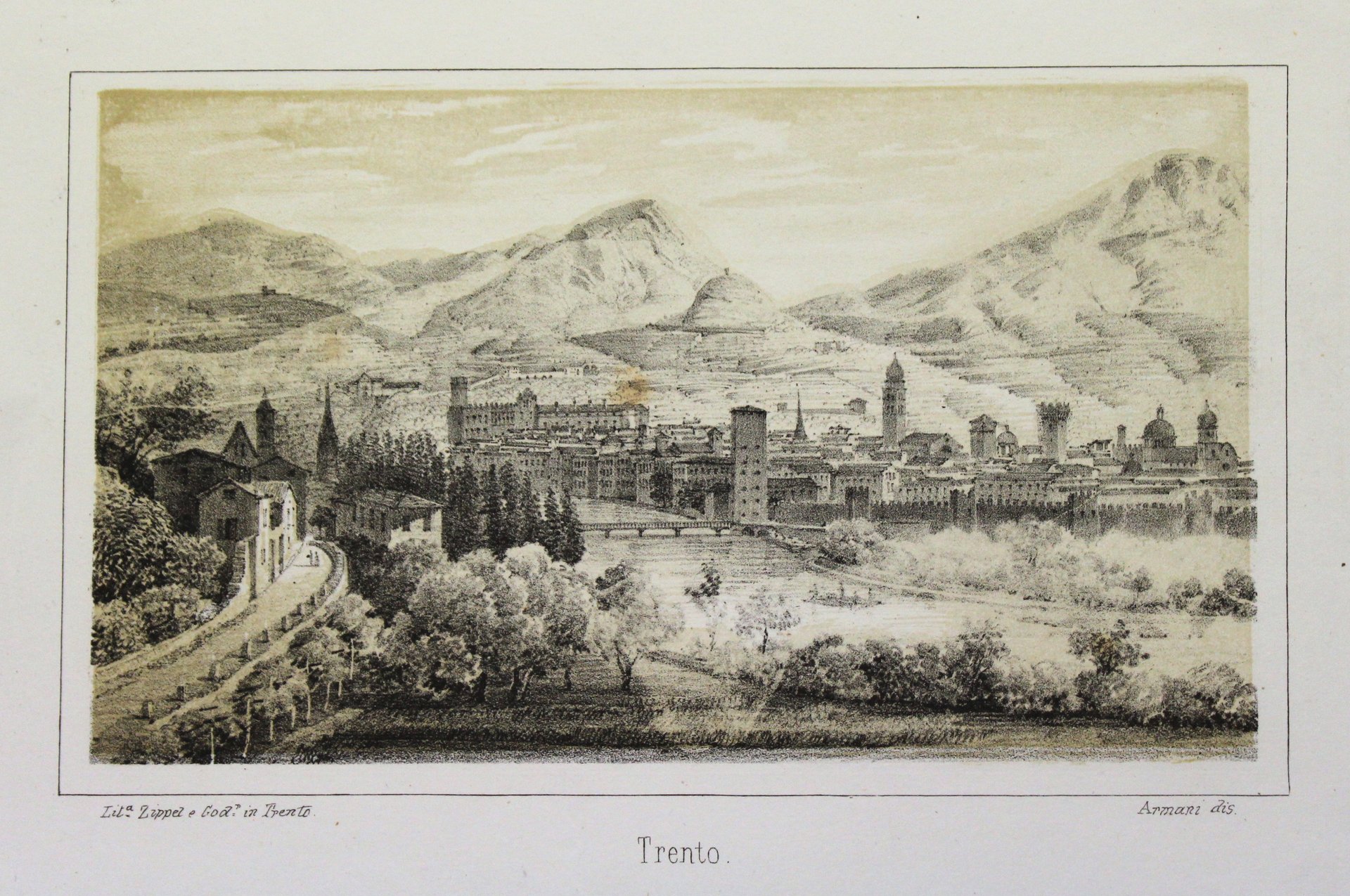 Litografia, mm 92x157 (immagine) tratta dalla rara serie pubblicata da Zippel e Godermaier. Basilio Armani (Riva del Garda 1817 – Malé 1899), fu pittore e incisore, reso celebre soprattutto dalle sue vedute litografiche di paesaggi gardesani, trentini e tirolesi. Ottimo esemplare assai marginoso.Invia<BR>