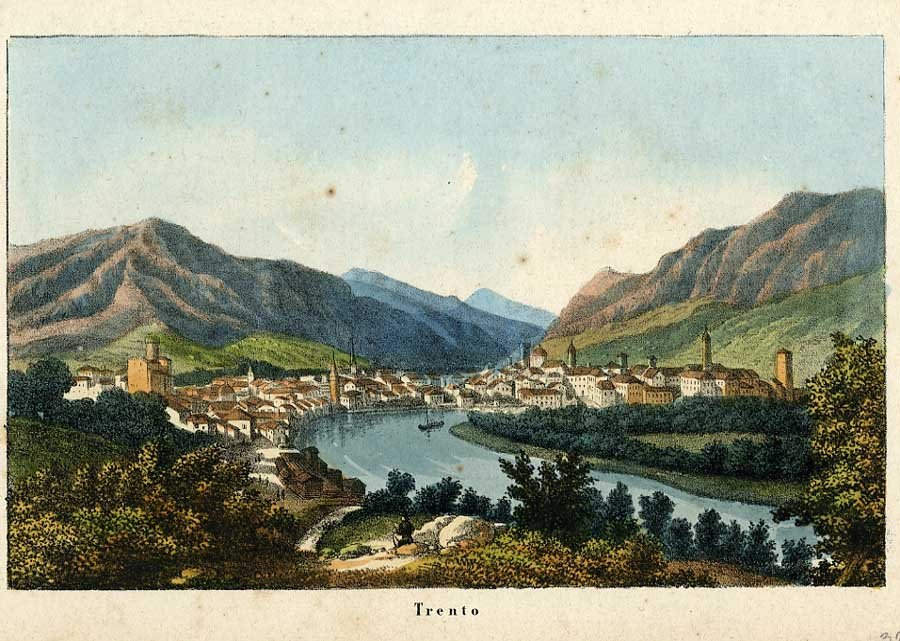 Calcografia colorata di dimensioni 156x247 mm. Condizioni : USATO - Stato : Buono, ordinari segni d'uso e del tempo. Altre note : Pianta panoramica incisa all'acquatinta raffigurante la città di Trento e il panorama circostante. La composizione riprende il lavoro di Schönherr-Martens variandone la scena in primo piano. Scheda bibliografica tratta da "Trento nelle Stampe d'Arte" di Aldo Chemelli, scheda n. 39 pag. 185.