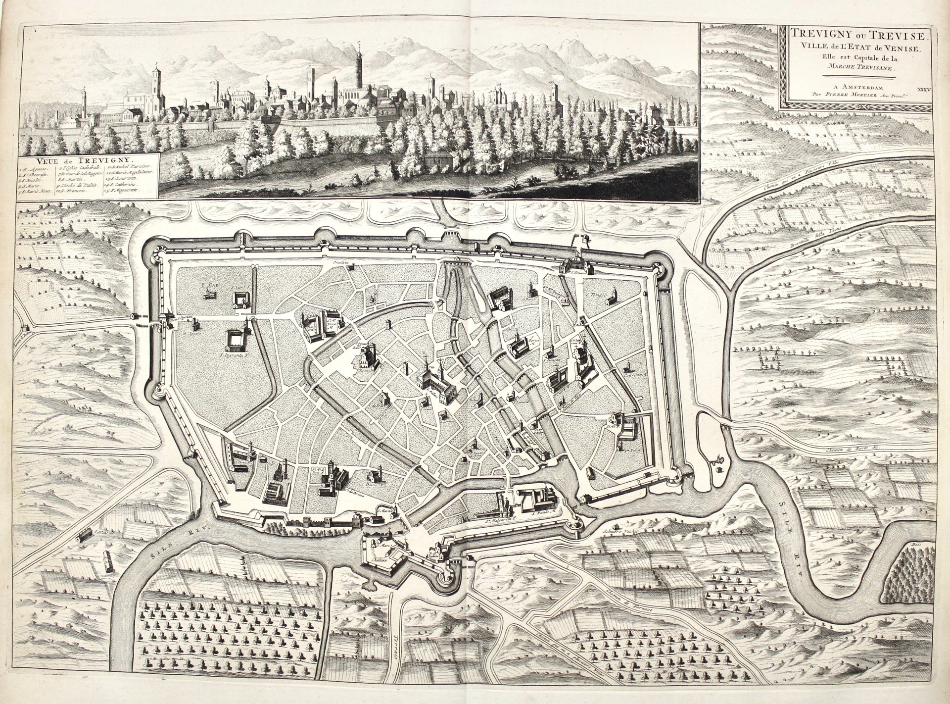 Incisione in rame, 420x590. Pianta della città con veduta generale in vignetta in alto a sin. tratta da "Novum Italiae Theatrum". Mortier, editore attivo ad Amsterdam ad inizio secolo, ristampò il "Theatrum Civitatum…Italiae" di Blaeu del 1663 aggiungendovi un quarto volume, relativo a nord Italia e Toscana. Ottimo esemplare. Basso, Treviso illustrata, 22.<BR>