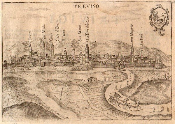 TREVISO – “Treviso” Veduta prospettica della città, con carrozza in primo piano e montagne sullo sfondo. il leone id San Marco in alto a dx.