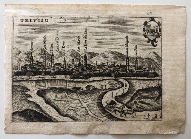 Francesco Bertelli, Padova, 1629. Pianta planimetrica della città tratta dal “Theatro delle Città d’Italia” di Pietro Bertelli, stampato dal figlio Francesco. Incisione in rame, b/n, cm 12,1 x 17,4 circa (alla lastra). Reintegrata una piccola parte di angolo in basso a destra, due leggere pieghe nella parte in alto a destra, nell'insieme conservazione comunque molto buona. .