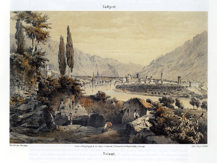 Cromolitografia di dimensioni 180x258 mm. Condizioni : USATO - Stato : Buono, ordinari segni d'uso e del tempo. Altre note : Luminosa cromolitografia con veduta panoramica della città di Trento. Contenuta nel volume "Zur Erinnerung an die Eröffnung der Eisenbahnstrecke von Verona nach Bozen im Jahre 1859", celebra l'apertura del tratto ferroviario Verona-Bolzano e infatti appare qui per la prima volta la nuova stazione ferroviaria. Litografata da J. Boyer von Berghof. Scheda bibliografica tratta da "Trento nelle Stampe d'Arte" di Aldo Chemelli, scheda n. 51 pagg. 206 e 207. Disponibile anche in cornice per 500 Euro.