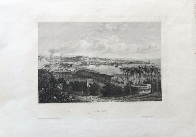 Bibl. Instit. in Hildbhan, 1855 circa. Incisione su acciaio, b/n, cm 10,5 x 16 (la parte figurata) più margini. Bella vedutina generale della città di Trieste col porto. In buono stato di conservazione.
