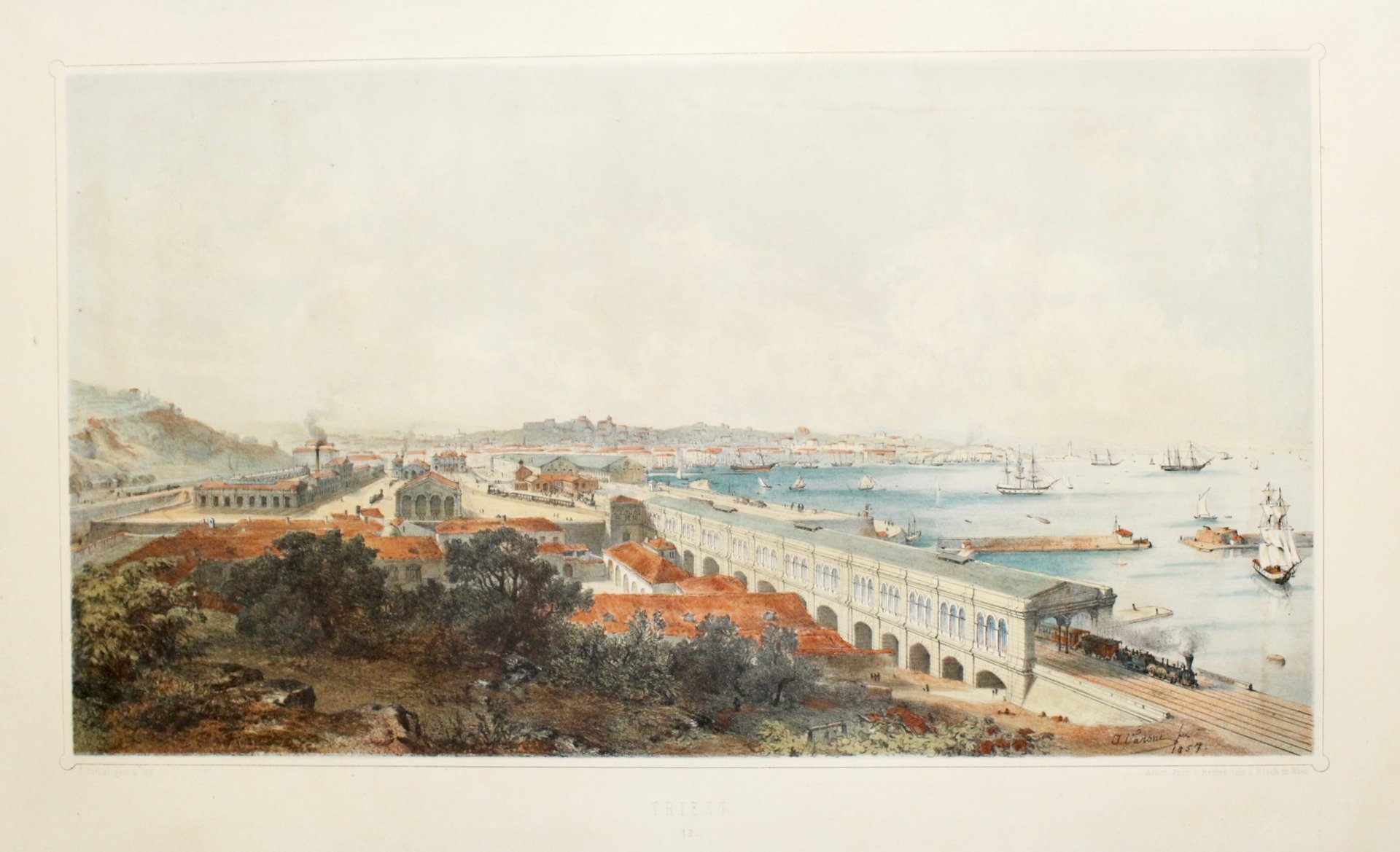 Litografia, mm 220x390, dipinta a mano, pubblicata da Reiffenstein & Roesch: In primo piano la nuova stazione ferroviaria con la città sullo sfondo. Buon esmplare con ampi margini