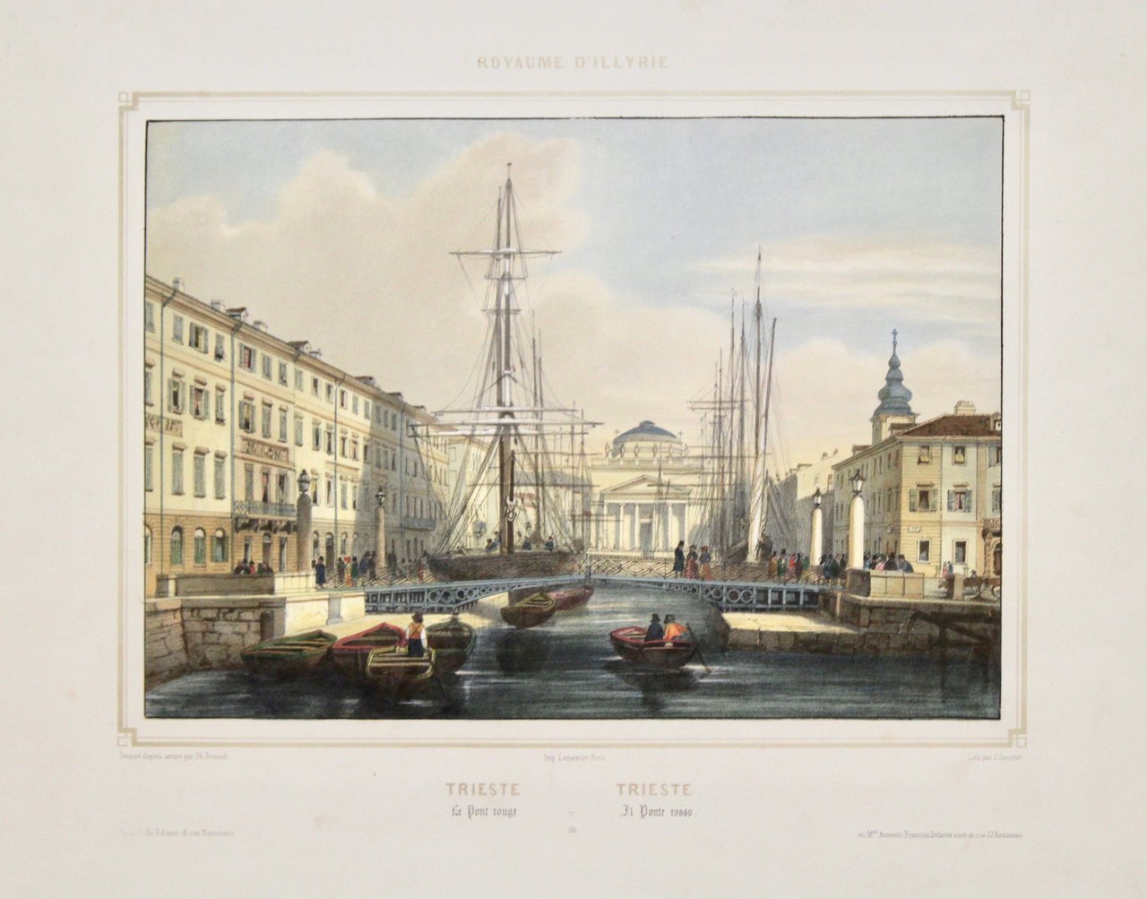 Litografia, dipinta magnificamente d'epoca "a la gomme", mm 190x270. Bella scorcio di Trieste con il Ponte rosso in primo piano ed il Tempio di Sant'Antonio sullo sfondo; veduta animata da barche e figure in primo piano, eseguita su disegno di Benoist, stampata da Lemercier. Assai marginosa e perfettamente conservata.