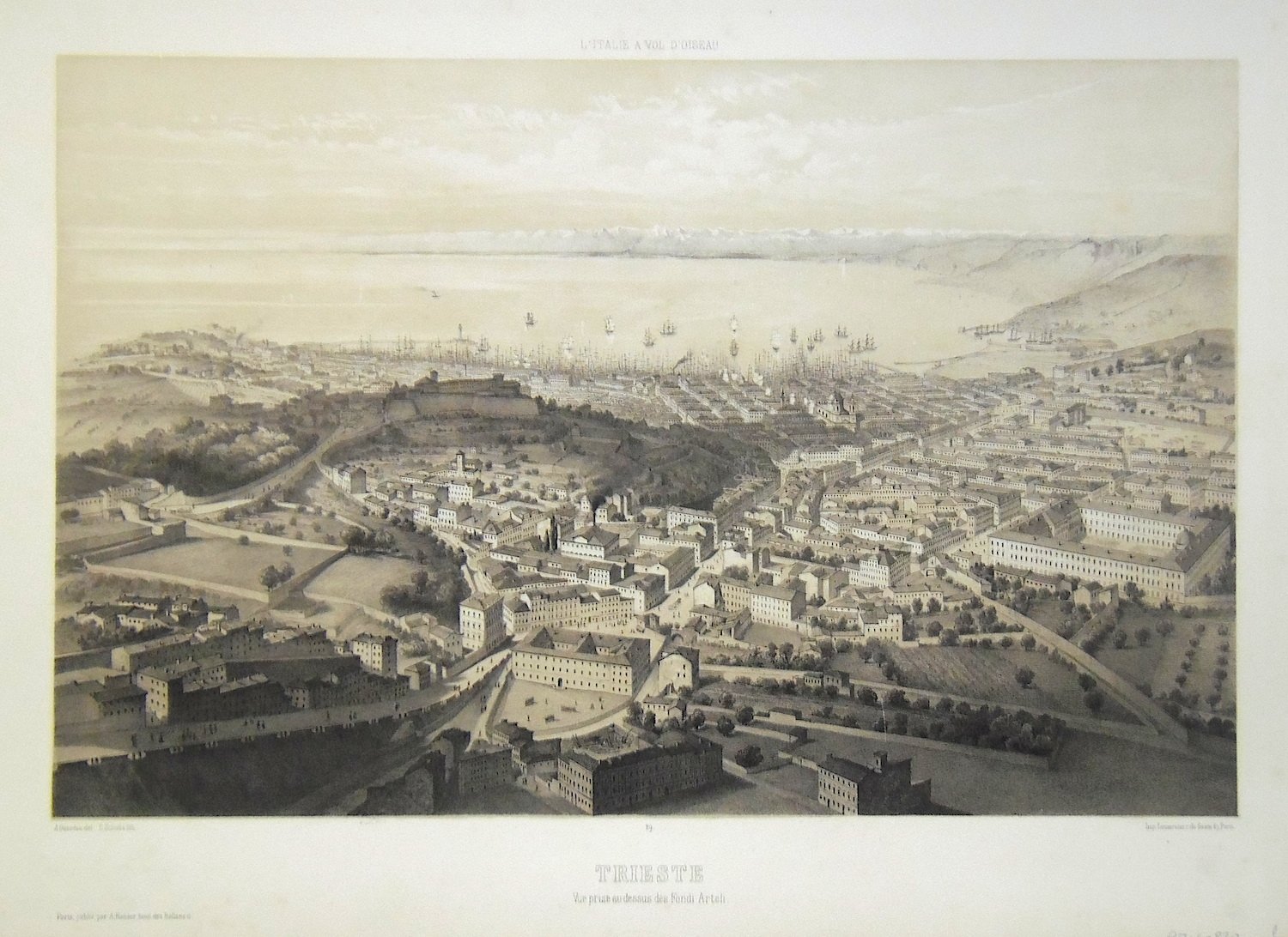 Litografia, 280x440. Rara veduta a volo d'uccello della città, tratta dal "L'Italie a Vol d'Oiseau", raccolta di vedute delle maggiori città italiane. Ottimo esemplare con ampi margini.<BR>