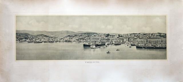 Fotoincisione, 1920 circa, b/n, cm 32,5 x 96 (al segno della lastra) più margini. Bellissima veduta generale della città di Trieste ripresa dal mare, numerose le navi e le imbarcazioni nel golfo adiacente la città, sullo sfondo le colline. Molto buono lo stato di conservazione.