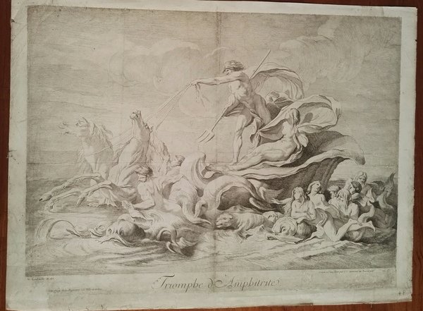 Bellissima incisione. Si tratta di un'acquaforte in discrete condizioni. Si noti che è rovinata (particolare attenzione si deve prestare alla piega nel centro della stampa). Si legge: Graveé a l'eau forte par C x. terminè au Burin par . Dimensioni: 48 cm x 64 cm. Nell'antica mitologia greca, Anfitrite era una dea del mare e moglie di Poseidone e la regina del mare