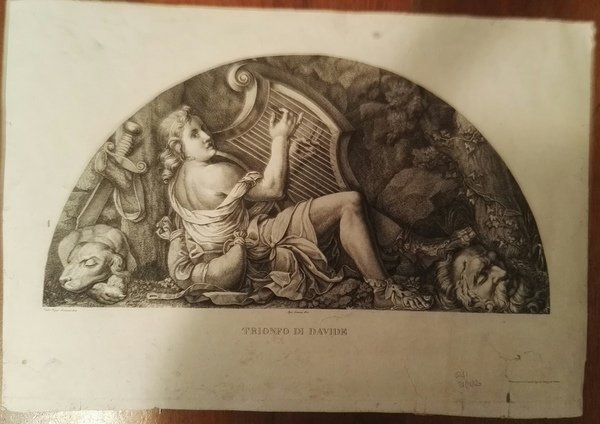 Bellissima incisione rappresentante il trionfo di Davide. Si noti la piega nella parte inferiore centrale della stampa. Agos. Comerio Dis. Dimensioni: 43 cm x 30 cm.