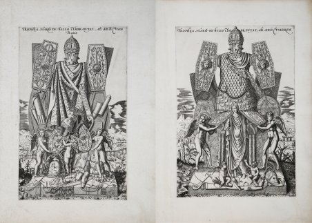 Coppia di incisioni al bulino, 1550 circa, prive di data ed indicazioni editoriali. Titolate in alto TROPHEA MARII DE BELLO CYMBR. PVTAT. AD AED. D. EVSEB. ROMAE e TROPHEA MARII DE BELLO CYMBR. PVTAT. AD AED. D. EVSEB. ROM. Esemplari nel secondo stato di quattro descritto da Rubach - secondo di tre per Alberti che non conosce la tiratura postuma di Giovanni Orlandi – avanti l’imprint di Claudio Duchetti. Il primo stato della lastra è una prova di stampa ante i titoli in alto. Marigliani sostiene che esisterebbe anche un’ulteriore tiratura di Van Schoel. Magnifiche prove, impressa su carta vergata coeva con filigrana “scala in uno scudo sormontato da stella” (cfr. Woodward nn. 244-245), con ampi margini, in ottimo stato di conservazione. “due gruppi marmorei di età domizianea con panoplie germaniche e daciche. I trofei vennero reimpiegati in un’immensa fontana costruita sopra il castello dell’Acqua Giulia, probabilmente da Alessandro Severo nel 286 d.C. La tradizione Medievale li riteneva i Trionfi di Mario sui Cimbri e sui Teutoni. Nel 1590, per ordine di Sisto V, le sculture vennero inserite nella balaustra del Campidoglio” (cfr. Marigliani, ' Lo splendore di Roma nell’Arte incisoria del Cinquecento). L’opera appartiene allo ' Speculum Romanae Magnificentiae, la prima iconografia della Roma antica. Le lastre figurano nell'Indice del Lafreri al n. 201, descritta come Trofei di Mario in doi parti. Lo ' Speculum ' ebbe origine nelle attività editoriali di Antonio Salamanca e Antonio Lafreri (Lafrery). Durante la loro carriera editoriale romana, i due editori - che hanno lavorato insieme tra il 1553 e il 1563 - hanno avviato la produzione di stampe di architettura, statuaria e vedutistica della città legate alla Roma antica e moderna. Le stampe potevano essere acquistate individualmente da turisti e collezionisti, ma venivano anche acquistate in gruppi più grandi che erano spesso legati insieme in un album. Nel 1573, Lafreri commissionò a questo scopo un frontespizio, dove compare per la prima volta il titolo Speculum Romanae Magnificentiae. Alla morte di Lafreri, due terzi delle lastre di rame esistenti andarono alla famiglia Duchetti (Claudio e Stefano), mentre un altro terzo fu distribuito tra diversi editori. Claudio Duchetti continuò l’attività editoriale, implementando le lastre dello Speculum con copie di quelle “perdute” nella divisione ereditaria, che fece incidere al milanese Amborgio Brambilla. Alla morte di Claudio (1585) le lastre furono cedute – dopo un breve periodo di pubblicazione degli eredi, in particolare nella figura di Giacomo Gherardi - a Giovanni Orlandi, che nel 1614 vendette la sua tipografia al fiammingo Hendrick van Schoel. Stefano Duchetti, al contrario, cedette le proprie matrici all’editore Paolo Graziani, che si associò con Pietro de Nobili; il fondo confluì nella tipografia De Rossi passando per le mani di editori come Marcello Clodio, Claudio Arbotti e Giovan Battista de Cavalleris. Il restante terzo di matrici della divisione Lafreri fu suddiviso e scisso tra diversi editori, in parte anche francesi: curioso vedere come alcune tavole vengano ristampate a Parigi da Francois Jollain alla metà del XVII secolo. Diverso percorso ebbero alcune lastre stampate da Antonio Salamanca nel suo primo periodo; attraverso il figlio Francesco, confluirono nella tipografia romana di Nicolas van Aelst. Altri editori che contribuirono allo Speculum furono i fratelli Michele e Francesco Tramezzino (autori di numerose lastre che confluirono in parte nella tipografia Lafreri), Tommaso Barlacchi, e Mario Cartaro, che fu l’esecutore testamentario del Lafreri, e stampò alcune lastre di derivazione. Per l’intaglio dei rami vennero chiamati a Roma e impiegati tutti i migliori incisori dell’epoca quali Nicola Beatrizet (Beatricetto), Enea Vico, Etienne Duperac, Ambrogio Brambilla e altri ancora. Questo marasma e intreccio di editori, incisori e mercanti, il pro. Pair of engravings by engraving, ca. 1550, lacking date and editorial indications. Titled at top TROPHEA MARII DE BELLO CYMBR. PVTAT. AD AED. D. EVSEB. ROMAE and TROPHEA MARII DE BELLO CYMBR. PVTAT. AD AED. D. EVSEB. ROM. Examples in the second state of four described by Rubach - second of three for Alberti who does not know the posthumous issue of Giovanni Orlandi – before the imprint of Claudio Duchetti. The first state of the plate is a proof print ante the titles at the top. Marigliani claims that an additional Van Schoel edition would also exist. Magnificent proofs, printed on contemporary laid paper with watermark "scale in a shield surmounted by star" (cf. Woodward nos. 244-245), with wide margins, in excellent condition. “Two marble groups of Domitian age with Germanic and Dacian panoplies. The trophies were reused in a huge fountain built above the Acqua Giulia castle, probably by Alexander Severus in 286 AD. Medieval tradition held them to be the Triumphs of Marius over the Cimbri and Teutons. In 1590, by order of Sixtus V, the sculptures were inserted into the balustrade of the Capitol” (translation from C. Marigliani, ' Lo splendore di Roma nell’Arte incisoria del Cinquecento). The works belongs to the Speculum Romanae Magnificentiae, the earliest iconography of ancient Rome. The Speculum originated in the publishing activities of Antonio Salamanca and Antonio Lafreri (Lafrery). During their Roman publishing careers, the two editors-who worked together between 1553 and 1563-started the production of prints of architecture, statuary, and city views related to ancient and modern Rome. The prints could be purchased individually by tourists and collectors, but they were also purchased in larger groups that were often bound together in an album. In 1573, Lafreri commissioned a frontispiece for this purpose, where the title Speculum Romanae Magnificentiae appears for the first time. Upon Lafreri's death, two-thirds of the existing copperplates went to the Duchett