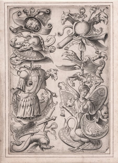 Bulino, 1550 circa. Da un soggetto di Polidoro da Caravaggio. Buona prova, impressa su carta vergata coeva, con sottili margini, applicata su antico supporto di collezione, in buono stato di conservazione. L’opera appartiene ad una serie che è catalogata nell’indice delle stampe di Antonio Lafrery del 1573 sotto il nome di Libro de Trofei cavati da disegni di Polidoro ad imitazione de gli Antichi. Alla morte del Lafrery (1577), le lastre passarono al nipote Claudio Duchetti e quindi a Paolo Graziani e Pietro de’ Nobili. Nell’inventario di quest’ultimo, risalente al 1584, la serie risulta essere di sedici stampe. Tuttavia le lastre risalgono al periodo 1550/53 e sono il frutto della rivalità prima, e fusione poi, delle tipografie di Antonio Salamanca e Antonio Lafrery. Bartsch attribuisce le incisioni ad Enea Vico. Rara. Engraving, about 1550. After Polidoro da Caravaggio. Good impression, printed on contemporary laid paper, with thin margins, laid down an antique mounting, in good condition. This work belong to a series that is listed in the index of prints by Antonio Lafrery of 1573 under the name of Libro de Trofei cavati da disegni di Polidoro ad imitazione de gli Antichi. On the death of Lafrery (1577), the plates passed to his nephew Claudio Duchetti and then to Paul Graziani and Pietro de 'Nobili. In the inventory of the latter dating back to 1584, the series turns out to be sixteen prints. However, the plates back to the period 1550/53 and are the result of the rivalry before, and then merging, printing works of Antonio Salamanca and Antonio Lafrery. Bartsch gives the incisions to Enea Vico. Rare.Guilmard 1880/1 21.10(4); Berlin 1939 540(3); Robert-Dumesnil 1835-71 VIII.72.153.II; IFF vol. I p.196. Cfr. Bartsch 438, 442, 447; Bury, The Print in Italy, pp. 60/2, 38; Guilmard 1880/1 21.10(4); Berlin 1939 540(3); Robert-Dumesnil 1835-71 VIII.72.153.II; IFF vol. I p.196.