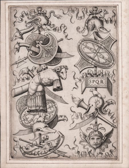 Bulino, 1550 circa. Da un soggetto di Polidoro da Caravaggio. Buona prova, impressa su carta vergata coeva, con sottili margini, applicata su antico supporto di collezione, in buono stato di conservazione. L’opera appartiene ad una serie che è catalogata nell’indice delle stampe di Antonio Lafrery del 1573 sotto il nome di Libro de Trofei cavati da disegni di Polidoro ad imitazione de gli Antichi. Alla morte del Lafrery (1577), le lastre passarono al nipote Claudio Duchetti e quindi a Paolo Graziani e Pietro de’ Nobili. Nell’inventario di quest’ultimo, risalente al 1584, la serie risulta essere di sedici stampe. Tuttavia le lastre risalgono al periodo 1550/53 e sono il frutto della rivalità prima, e fusione poi, delle tipografie di Antonio Salamanca e Antonio Lafrery. Bartsch attribuisce le incisioni ad Enea Vico. Rara. Trophies with a breast plate and a rams head. Engraving, about 1550. After Polidoro da Caravaggio. Lettered on plaque 'SPQR', bottom centre 'Ant Lafreri'.Good impression, printed on contemporary laid paper, with thin margins, laid down an antique mounting, in good condition. This work belong to a series that is listed in the index of prints by Antonio Lafrery of 1573 under the name of Libro de Trofei cavati da disegni di Polidoro ad imitazione de gli Antichi. On the death of Lafrery (1577), the plates passed to his nephew Claudio Duchetti and then to Paul Graziani and Pietro de 'Nobili. In the inventory of the latter dating back to 1584, the series turns out to be sixteen prints. However, the plates back to the period 1550/53 and are the result of the rivalry before, and then merging, printing works of Antonio Salamanca and Antonio Lafrery. Bartsch attributes the engraving to Enea Vico. Rare. Cfr. Bartsch 438, 442, 447; Bury, The Print in Italy, pp. 60/2, 38; Guilmard 1880/1 21.10(4); Berlin 1939 540(3); Robert-Dumesnil 1835-71 VIII.72.153.II; IFF vol. I p.196.