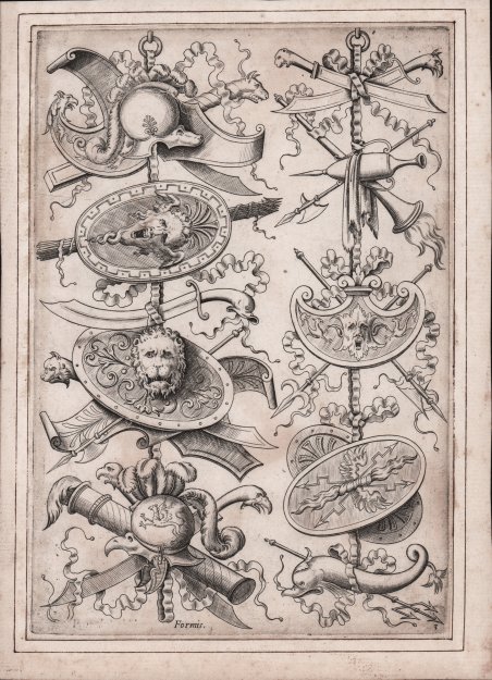 Bulino, 1550 circa. Da un soggetto di Polidoro da Caravaggio. Buona prova, impressa su carta vergata coeva, con sottili margini, applicata su antico supporto di collezione, in buono stato di conservazione. L’opera appartiene ad una serie che è catalogata nell’indice delle stampe di Antonio Lafrery del 1573 sotto il nome di Libro de Trofei cavati da disegni di Polidoro ad imitazione de gli Antichi. Alla morte del Lafrery (1577), le lastre passarono al nipote Claudio Duchetti e quindi a Paolo Graziani e Pietro de’ Nobili. Nell’inventario di quest’ultimo, risalente al 1584, la serie risulta essere di sedici stampe. Tuttavia le lastre risalgono al periodo 1550/53 e sono il frutto della rivalità prima, e fusione poi, delle tipografie di Antonio Salamanca e Antonio Lafrery. Bartsch attribuisce le incisioni ad Enea Vico. Rara. Engraving, about 1550. After Polidoro da Caravaggio. Good impression, printed on contemporary laid paper, with thin margins, laid down an antique mounting, in good condition. This work belong to a series that is listed in the index of prints by Antonio Lafrery of 1573 under the name of Libro de Trofei cavati da disegni di Polidoro ad imitazione de gli Antichi. On the death of Lafrery (1577), the plates passed to his nephew Claudio Duchetti and then to Paul Graziani and Pietro de 'Nobili. In the inventory of the latter dating back to 1584, the series turns out to be sixteen prints. However, the plates back to the period 1550/53 and are the result of the rivalry before, and then merging, printing works of Antonio Salamanca and Antonio Lafrery. Bartsch gives the engravings to Enea Vico. Rare. Cfr. Bartsch 438, 442, 447; Bury, The Print in Italy, pp. 60/2, 38; Guilmard 1880/1 21.10(4); Berlin 1939 540(3); Robert-Dumesnil 1835-71 VIII.72.153.II; IFF vol. I p.196.