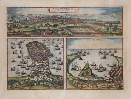 Tre vedute incise su un foglio raffiguranti: la città di Tunisi, la penisola di Mahdiya e il Peñón de Vélez de la Gomera; tratte dal secondo volume del ' Civiates Orbis Terrarum ' di Braun&Hogenberg.La seconda vista a volo d'uccello rappresenta la penisola di Mahdia, Aphrodisium o Africa nel mezzo della battaglia terrestre e navale di riconquista della Spagna contro le forze ottomane. La battaglia, che vedeva le forze spagnole capeggiate dall'ammiraglio Andrea Doria e il maltese Claude de la Sengle, si svolse nel mese di settembre 1550. ' Mahdia, o il Corno d'Africa, è localizzata in un antico sito che, nel XVI secolo, si pensava corrispondesse ad Aphrodisium di Tolomeo. La terza veduta raffigura una piccola isola rocciosa sotto assedio dei cannoni sia da terra sia dal mare. La penisola di Peñón de Vélez de la Gomera era sotto il dominio spagnolo dal 1508. In seguito, passò sotto il dominio marocchino per 42 anni fino alla riconquista spagnola del 1564. La veduta deriva da un'incisione di Giovanni Francesco Camocio, circa 1570. L’opera è inserita nel ' Civitates Orbis Terrarum, il primo atlante devoto esclusivamente alle piante e vedute delle principali città del mondo. Il primo volume delle ' Civitates Orbis Terrarum ' fu pubblicato a Colonia nel 1572. Il sesto e ultimo volume apparve nel 1617. Questo grande atlante di città – cartografia urbana - curato da Georg Braun e inciso in gran parte da Franz Hogenberg, conteneva 546 prospettive, vedute a volo d'uccello e vedute cartografiche di città di tutto il mondo. Franz Hogenberg realizzò le tavole dei primi quattro volumi e Simon van den Neuwel (Novellanus, attivo dal 1580) quelle dei volumi V e VI. Georg Braun (1541-1622), un ecclesiastico di Colonia, fu il principale redattore dell'opera e fu molto aiutato nel suo progetto dalla vicinanza e dal continuo interesse di Abraham Ortelius, il cui ' Theatrum Orbis Terrarum ' del 1570 fu, come raccolta sistematica e completa di mappe di stile uniforme, il primo vero atlante. Le ' Civitates, ' in effetti, erano destinate ad accompagnare il ' Theatrum, ' come indicato dalla somiglianza dei titoli e dai riferimenti contemporanei sulla natura complementare delle due opere. Tuttavia, le ' Civitates ' erano progettate per avere un approccio più popolare, senza dubbio perché la novità di una raccolta di piante e vedute di città rappresentava un'impresa commerciale più rischiosa di un atlante mondiale, per il quale c'erano stati diversi precedenti di successo. Franz Hogenberg (1535-1590) era figlio di un incisore di Monaco che si era stabilito a Malines. Incise la maggior parte delle tavole del ' Theatrum ' di Ortelius e la maggior parte di quelle delle ' Civitates, e potrebbe essere anche indicato come il responsabile dell'origine del progetto. Oltre un centinaio di artisti e cartografi diversi, il più importante dei quali fu l'artista di Anversa Georg Hoefnagel (1542-1600), fornirono i disegni per le tavole delle ' Civitates. Hoefnagel non solo contribuì alla maggior parte del materiale originale per le città spagnole e italiane, ma rielaborò e modificò anche quello di altri collaboratori. Dopo la morte di Hoefnagel, il figlio Jakob continuò il lavoro per le ' Civitates. Gli autori della raccolta si proponevano di raffigurare "non icones et typi urbium", cioè non immagini generiche e tipizzate, "sed urbes ipsae admirabili caelaturae artificio, spectantium oculis subiectae appareant": non intendeva alludere o idealizzare, ma rappresentare fedelmente sulla carta, riprodurre esattamente, e in tempo reale, ciò che l'occhio vede, come annunciato nella prefazione al primo volume delle ' Civitates Orbis Terrarum. Incisione in rame, bella coloritura coeva, in ottimo stato di conservazione. Three copper engraved views of Tunis, Mahdiya and Peñón de Vélez de la Gomera, from the second volume of Braun & Hogenberg's ' Civitates Orbis Terrarum ' with German text to verso. The second view depicts the massive recapture at sea and on land by the Spanish Admiral Andrea Doria and the Maltese Claude de la Sengle in September 1550. Mahdia, or the Horn of Africa, is located on an ancient site, which in the 16th century was thought to be Ptolemy's Aphrodisium. The third view depicts a small rocky island under siege cannon fire from the land as well as from the sea. Fortifications with towers, walls and planted flags can be identified on the sheer cliffs of the island. The Spanish, battling the resident pirates there, initially captured the island in 1508. Afterwards it fell under Moroccan rule for 42 years until the Spanish won it back 1564. after an engraving by Giovanni Francesco Camocio, circa 1570. The work is included in the ' Civitates Orbis Terrarum, the first atlas devoted exclusively to plans and views of the world's major cities. Printed in six volumes between 1572 and 1617 it was so successful and widespread that several editions translated into Latin, German and French were printed. The first volume of the ' Civitates Orbis Terrarum ' was published in Cologne in 1572. The sixth and the final volume appeared in 1617. This great city atlas, edited by Georg Braun and largely engraved by Franz Hogenberg, eventually contained 546 prospects, bird-eye views and map views of cities from all over the world. Fransz Hogenberg produced the plates for the first four books, and Simon van den Neuwel (Novellanus, active since 1580) those for volumes V and VI. Georg Braun (1541-1622), a cleric of Cologne, was the principal editor of the work, and was greatly assisted in his project by the close, and continued interest of Abraham Ortelius, whose ' Theatrum Orbis Terrarum ' of 1570 was, as a systematic and comprehensive collection of maps of uniform style, the first true atlas. The ' Civitates, ' indeed, was intended as a companion for the ' Theatrum, ' as indicated by the similarity in the titles and by contemporary references regarding the complementary nature of two works. Nevertheless, the '