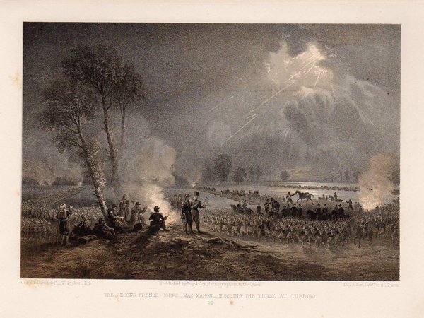TURBIGO - Guerra d'Italia - "The Second French corps Mac Mahon crossing the Ticino at Turbigo" Il Secondo Corpo Francese Mac-Mahon che passa il Ticino a Turbigo. Suggestiva litografia a colori con le truppe che bivaccano ed attraversano i ponti.