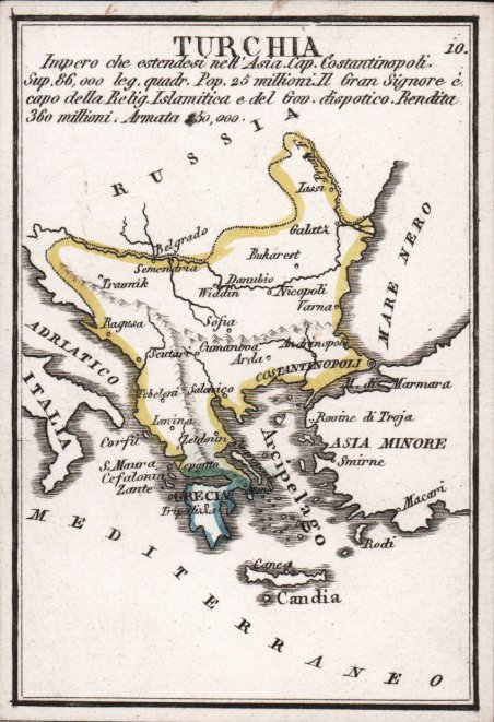 Rara mappa in miniatura tratta dal ' Piccolo Atlante per la Gioventù composte di 40 tavole geografiche con la descrizione delle Superficie, popolazioni, religioni, forma di governo, rendite, armate, ed altre notizie storico statistiche ' di Pietro e Giuseppe Vallardi, stampato a Milano, senza data, ma circa 1830. L'atlante consiste in un titolo e quaranta mappe stampate su carta spessa. Le carte sono divise in quattro serie: Europa, Asia, America e Africa; ogni set contiene nove mappe regionali dei paesi più importanti. Come dice il titolo, ogni mappa fornisce informazioni su geografia, popolazione, religione, governo, entrate e forza militare. Anche se l'atlante non è datato, una data approssimativa può essere accertata dalla mappa di Argentina e Uruguay. Sulla mappa l'Argentina è chiamata ' 'Confederazione del Rio della Plata'. Le Province Unite del Rio de la Plata era il nome iniziale per la nuova Argentina indipendente. Il nome fu abbandonato alla fine del terzo decennio in favore di Argentina. La mappa mostra anche un Uruguay indipendente, quindi dopo il Trattato di Montevideo del 1828. I Vallardi erano una famiglia di rinomati editori milanesi. Al capostipite Francesco (1736-1799) succedettero i figli Pietro, Santo Francesco, Giuseppe e Cesare Paolo. Nel 1812 rimasero in società Pietro (1770-1819) e Giuseppe (1784-1861), che intitolarono (1812) la ditta ai ' Fratelli Vallardi ' distinguendosi nella pubblicazione di libri e stampe d'arte. Dal 1818 Giuseppe, rimasto unico proprietario, diede grande impulso anche al commercio calcografico. Acquaforte, coloritura coeva dei contorni, in ottimo stato di conservazione. Rare miniature map taken from the ' Piccolo Atlante per la Gioventu composte di 40 tavole geografiche con la descrizione delle Superficie, popolazioni, religioni, forma di governo, rendite, armate, ed altre notizie storico statistiche ' by Pietro & Giuseppe Vallardi, published in Milan, circa 1830. The atlas consists of a title and forty maps each printed on thick card. The cards are divided into four sets: Europe, Asia, America, and Africa; with each set containing nine regional maps of the most prominent countries. As the title states, each map gives information upon the geography, population, religion, government, revenues and military strength. ' Although the atlas is not dated, an approximate date maybe ascertained from the map of Argentina and Uruguay. Upon the map Argentina is named the ' ?‘Confederazione del Rio della Plata’. The United Provinces of Rio de la Plata was an early name for the newly independent Argentina. The name was dropped by the end of the 1820s in favour of Argentina. The map also shows an independent Uruguay, which gained its independence at the Treaty of Montevideo in 1828. The Vallardis were a family of renowned Milanese publishers. The progenitor Francesco (1736-1799) was succeeded by his sons Pietro, Santo Francesco, Giuseppe, and Cesare Paolo. In 1812 Pietro (1770-1819) and Giuseppe (1784-1861) remained in partnership, naming (1812) the firm the ' Fratelli Vallardi, distinguishing themselves in the publication of art books and prints. From 1818 Giuseppe, who remained the sole owner, also gave great impetus to the intaglio trade. Etching, contemporary coloring of the outlines, in very good condition. Cfr.