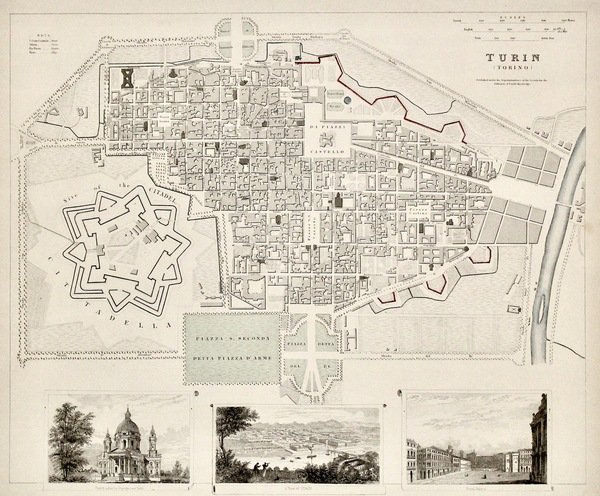 Incisione in acciaio di J. Hennschall, 300x374, lieve coloritura parziale coeva. Bella pianta arricchita da tre riquadri in b. raffiguranti Superga, veduta generale e palazzo reale. Margine d. parzialmente rifatto con piccola parte entro il riquadro della stampa.