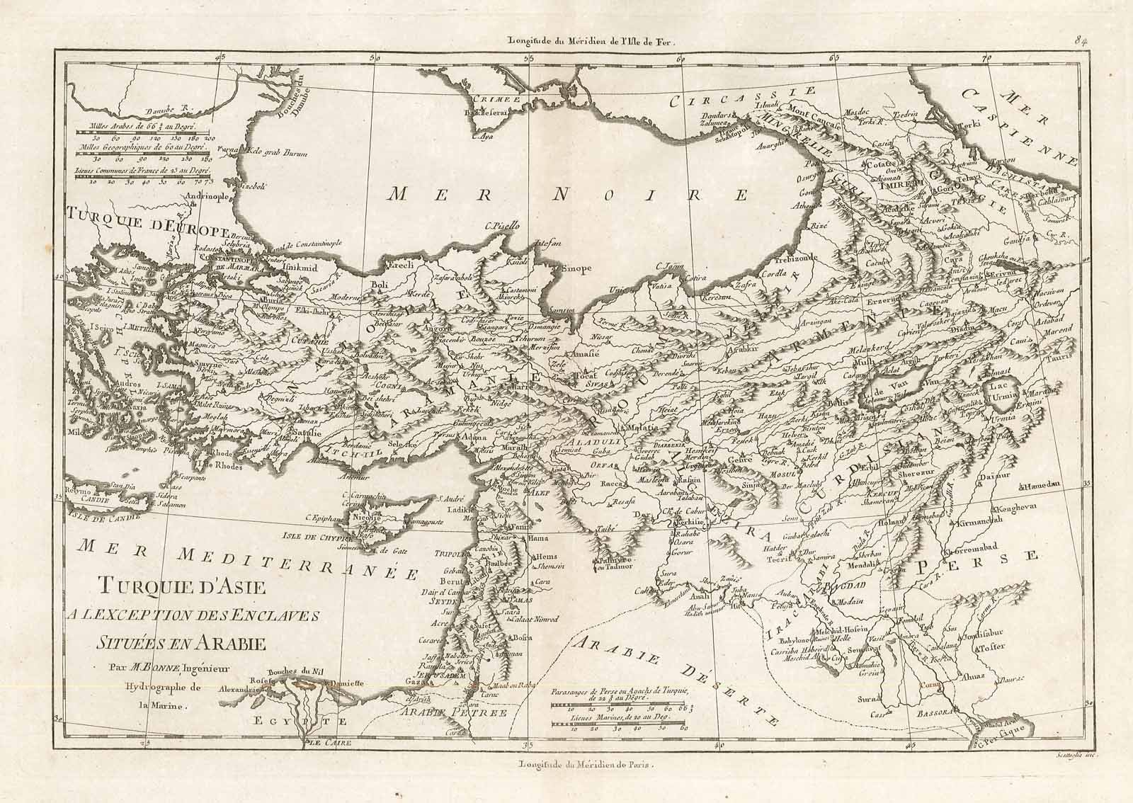 Carta geografica raffigurante: Turchia, Siria, Cipro, Iraq, Iran. Rigobert Bonne (1727-1795) fu uno dei più importanti cartografi del tardo XVIII secolo, nel 1773 succedette a Jacques Bellin come cartografo reale in Francia.