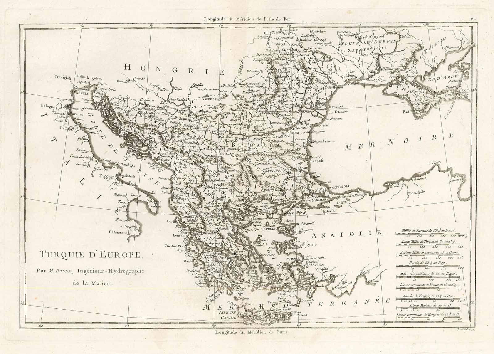 Carta geografica, antica ed originale, raffigurante il territorio della Turchia europea. Piega centrale editoriale. Rigobert Bonne (1727-1795) fu uno dei più importanti cartografi del tardo XVIII secolo. Nel 1773 succedette a Jacques Bellin come cartografo reale in Francia.