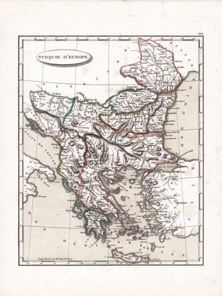 Carta geografica tratta dalla ' Géographie moderne, rédigée sur un nouveau plan, ou Description historique, politique, civile et naturelle des empires, royaumes, Etats et leurs colonies.: renfermant la concordance des principaux points de la géographie ancienne et du moyen âge, avec la géographie modern ' traduzione francese del trattato di Geografia di John Pinkerton, pubblicato a Parigi nel 1804. Le carte geografiche sono elaborate da Jean-Nicolas Buache su quelle disegnate da Aaron Arrowsmith per l’edizione inglese del trattato di Pinkerton. Jean-Nicolas Buache de La Neuville è stato un idrografo e geografo francese attivo tra la fine del XVIII e l'inizio del XIX secolo. Direttore del Dépôt des Cartes de la Marine, fu l'ultimo a fregiarsi del titolo di “primo geografo del re”. Eletto membro dell'Accademia delle Scienze nel 1770, fu incaricato da Luigi XVI di redigere nel 1788 le mappe dei baliati del regno di Francia. J. N. Buache era un ardente sostenitore delle idee cartografiche radicali di suo zio, Phillip Buache, riguardo all'ipotizzata esistenza di un "passaggio a nord-ovest". Come Phillip, Jean Nicholas credeva che la cartografia teorica, cioè l'applicazione delle teorie geografiche, potesse riempire i luoghi vuoti del globo prima che gli esploratori reali vi si recassero. Acquaforte con bellissima coloritura coeva, in ottimo stato di conservazione. Map taken from ' Géographie moderne, rédigée sur un nouveau plan, ou Description historique, politique, civile et naturelle des empires, royaumes, Etats et leurs colonies.: renfermant la concordance des principaux points de la géographie ancienne et du moyen âge, avec la géographie modern ' French translation of John Pinkerton's treatise on Geography, published in Paris in 1804. The maps are elaborated by Jean-Nicolas Buache on those drawn by Aaron Arrowsmith for the English edition of Pinkerton's treatise. Jean-Nicolas Buache de La Neuville was a French hydrographer and geographer active in the late 18th and early 19th centuries. Director of the Dépôt des Cartes de la Marine, he was the last to hold the title "first geographer to the king." Elected a member of the Academy of Sciences in 1770, he was commissioned by Louis XVI to draw up maps of the bailiwicks of the kingdom of France in 1788. J. N. Buache was an ardent supporter of the radical cartographic ideas of his uncle, Phillip Buache, regarding the hypothesized existence of a "northwest passage." Like Phillip, Jean Nicholas believed that theoretical cartography, that is, the application of geographical theories, could fill in the empty places on the globe before actual explorers went there. Etching with beautiful contemporary coloring, in excellent condition. Cfr.